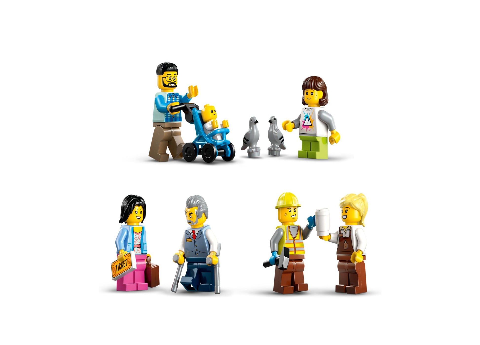 - Six lively minifigures plus a tiny tot and two pigeons.