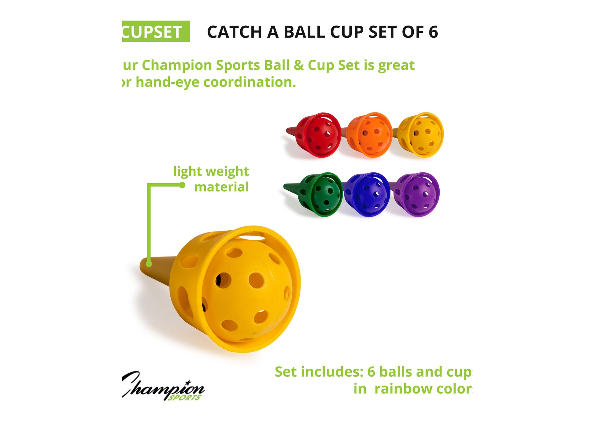 The Champion Sports Rainbow Catch-A-Ball Cup Set features: