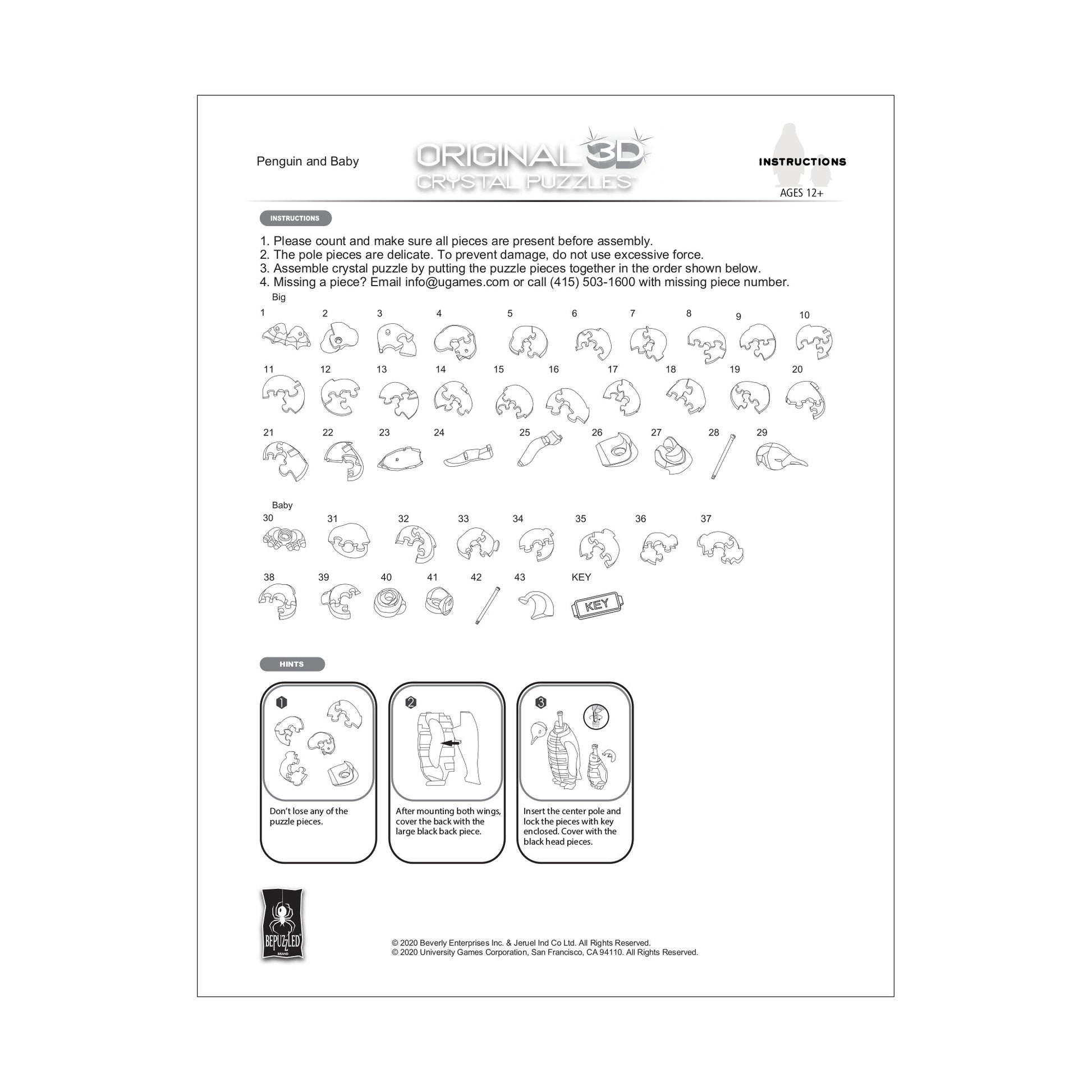 Piece together a frosty adventure with the 3D Crystal Puzzle - Penguin and Baby! This shiny, icy puzzle provides not just a brain-teasing challenge but also a stunning display piece once completed. Comprising 43 precision-cut plastic pieces, each one locks tight to gradually reveal the loving duo of a parent and baby penguin in sparkling black and white.