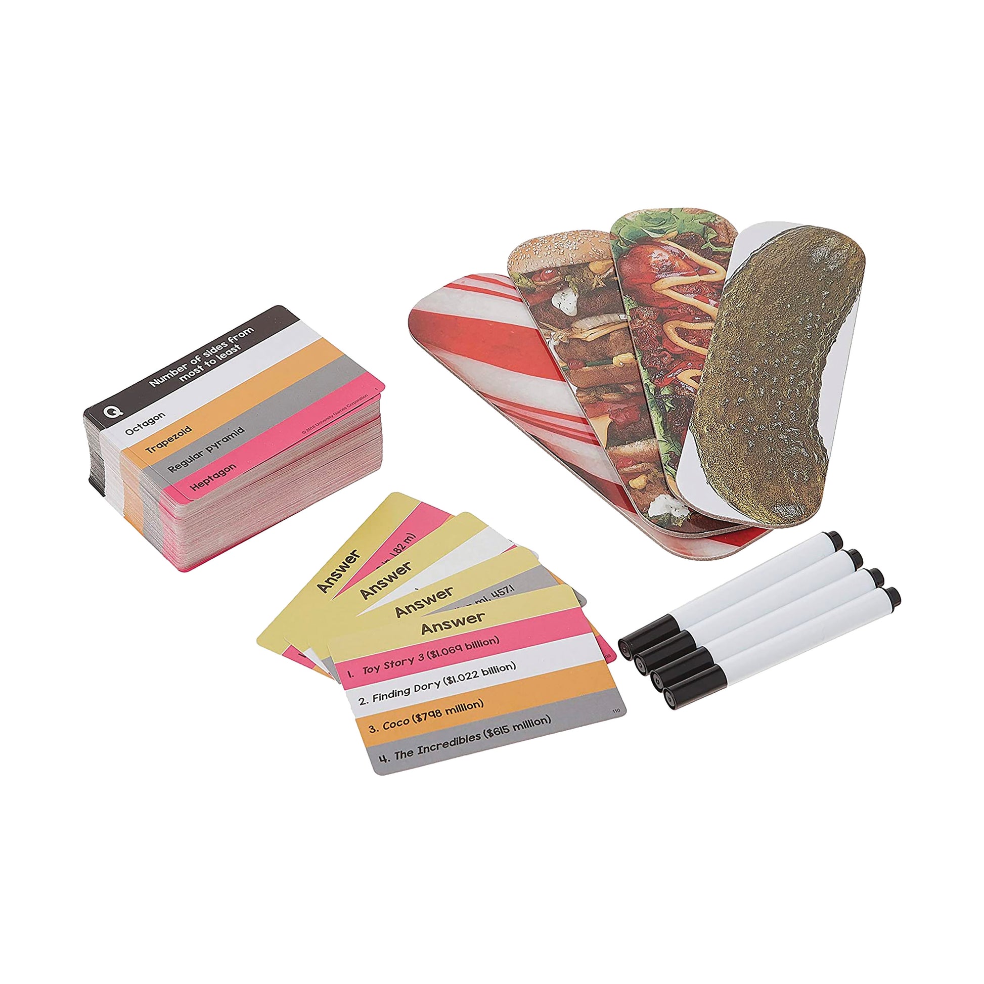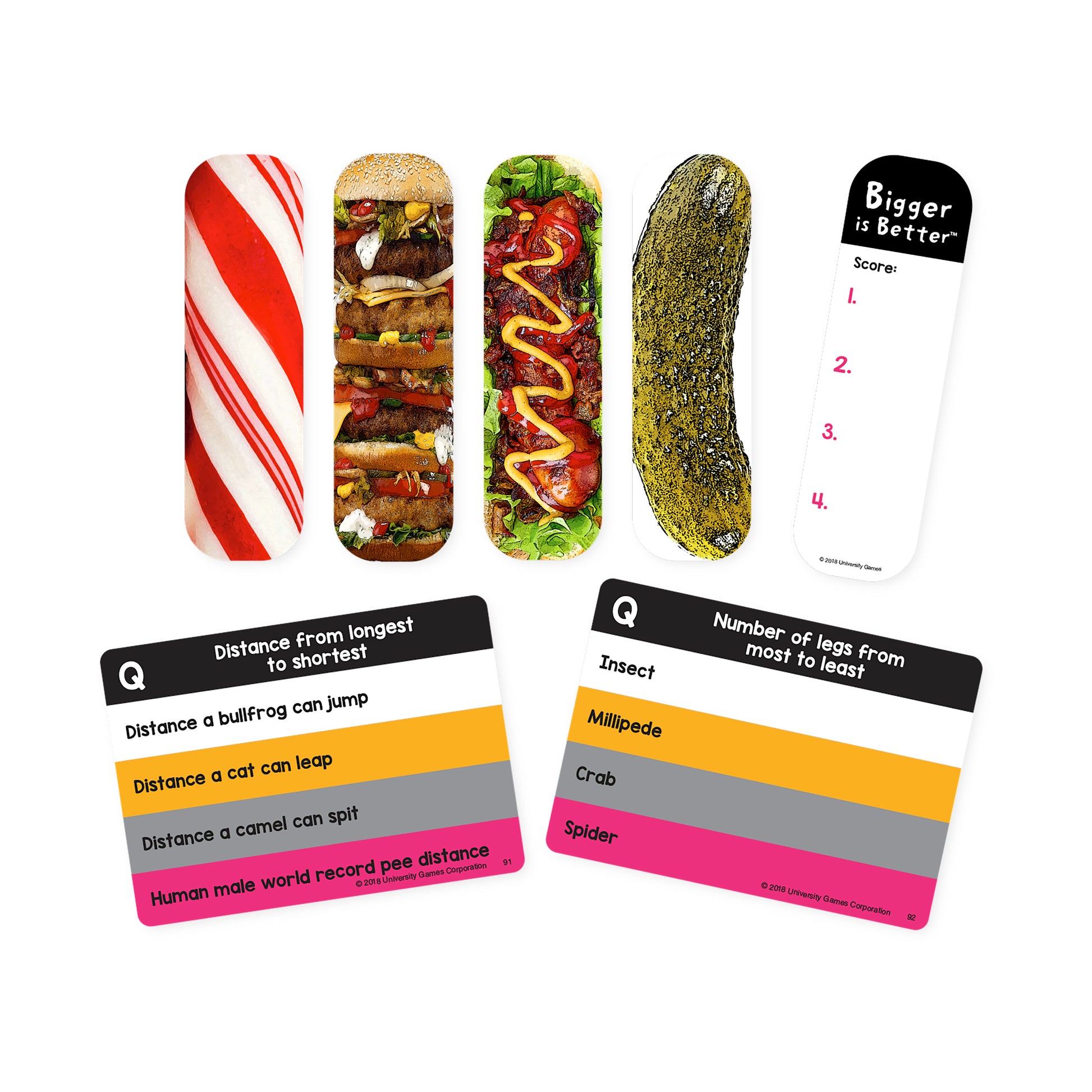 Size up the fun with Bigger is Better, the hilarious game that tests your ability to estimate and arrange! From juicy hamburgers to snappy hot dogs, choose your quirky paddle and challenge friends and family to sort various amusing and bizarre distances. Who can accurately line up the distance a camel can spit or the record-human male pee distance? Guessing gets giggly in this topsy-turvy size sorting saga!