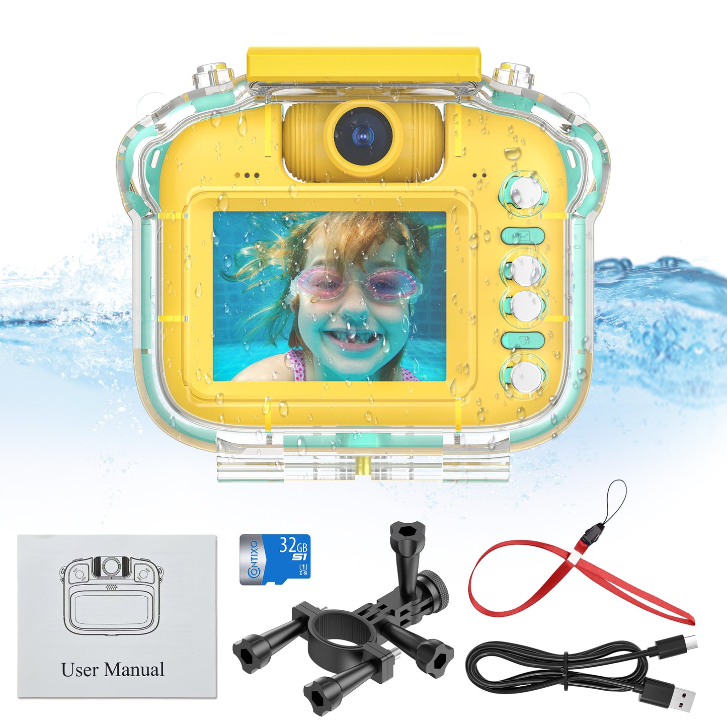 Snap, flash, and splash! Let your little explorer capture the magical underwater world with the Contixo Kids Waterproof Camera - 1080p HD, 5x Zoom, Silicone Case, Built-in Games, Digital Toy for Ages 3-12 - Yellow. Engineered for watery fun and wild outdoor activities, this sturdy camera dives up to 98 feet deep ensuring no puddle, pool, or ocean adventure is left uncaptured. Its easy-to-hold, bright yellow silicone case, adorned with cute forest animal designs, is not just about looks—it shields against tumbles and falls. Crisp 1080p HD videos and the 5x zoom bring distant scenes into clear view, while 15 funky photo frames add a dash of creativity to each shot. When the action settles, four delightful puzzle games keep the entertainment going. Compact and crafted for small hands, this camera is ready for every escapade your kid dreams up!