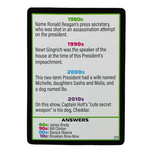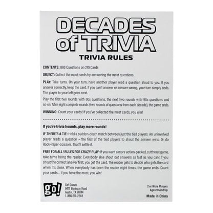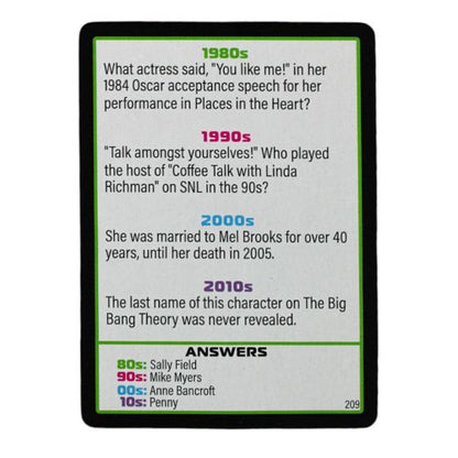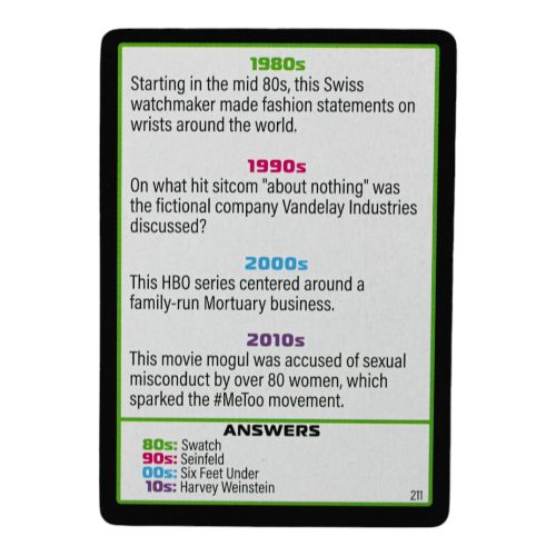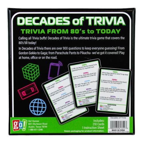 Embark on a nostalgic journey through the 80s to 2000s with Decades of Trivia Game! Test your knowledge of pop culture, tech & history in lively challenges. 880+ questions across 210 cards spark rich discussions. Portable fun for ages 10+. Shop now on toysrus.com!