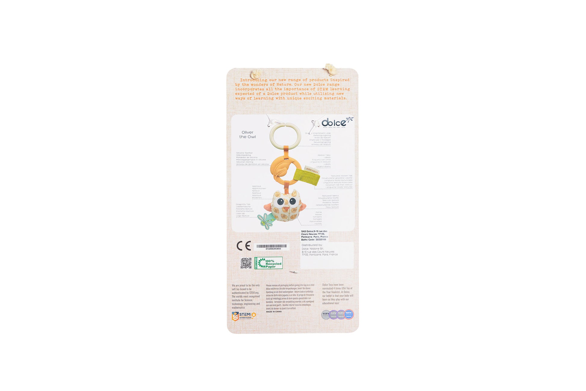Meet Dolce Oliver the Owl, your child's new feathery friend and the cuddliest guide through early learning adventures! With vibrant colors and soft plush fabric, this stuffed owl is designed not just for hugs but also for stimulating young minds with tactile and auditory experiences. Join Oliver as he introduces the basics of patterns, sounds, and coordination in a captivating, playful manner.