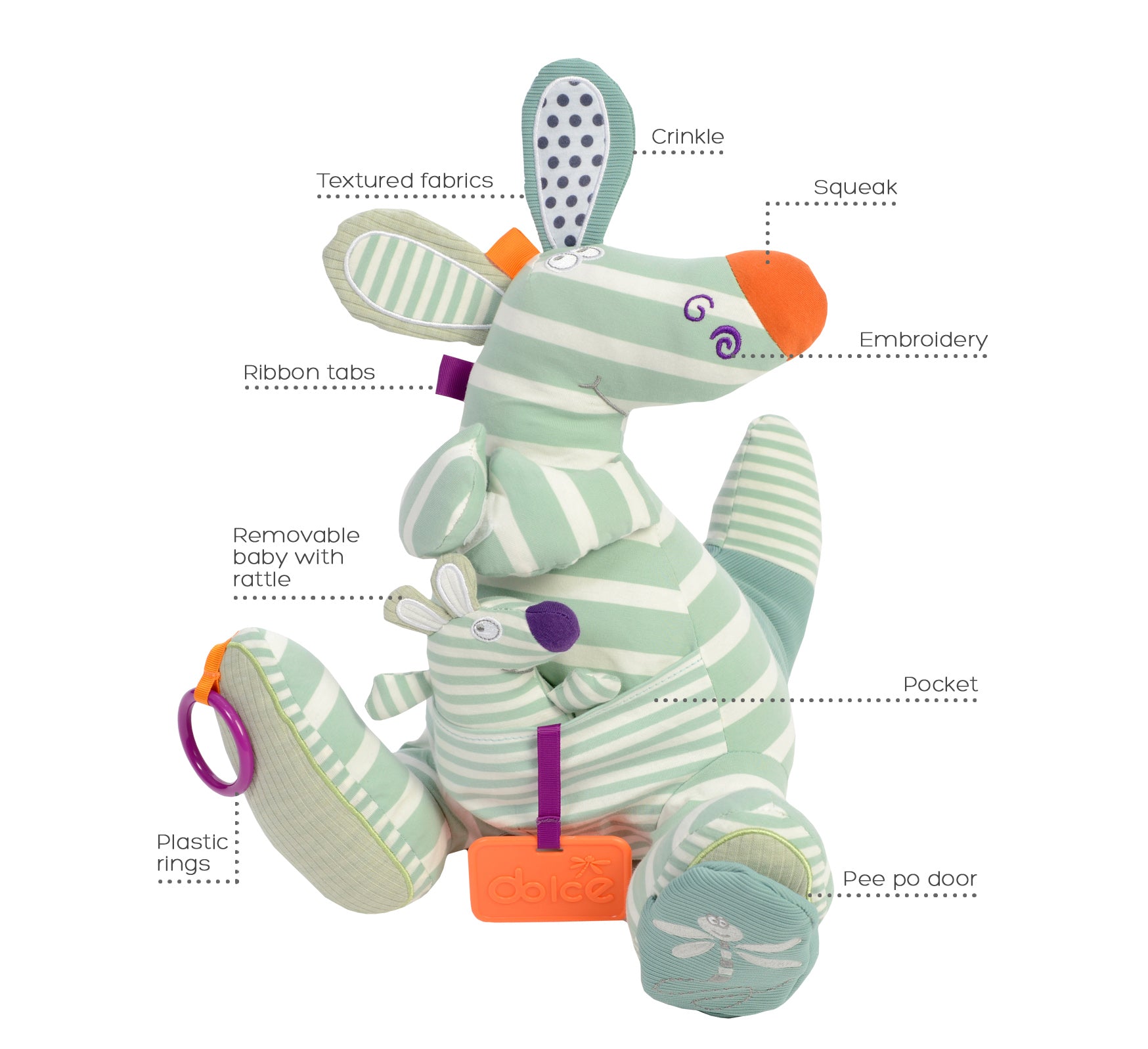 Discover endless cuddles and interactive play with Dolce Ozzie the Kangaru 26-inch plush! This giant kangaroo features a baby Joey, shaker egg pocket, crunching & squeaking sounds, plus textured labels for sensory exploration. Perfect from birth, Ozzie brings Australian adventure home with surprises in every pocket. Shop now on toysrus.com for this developmental plush companion that engages babies through sound, touch, and imaginative play!