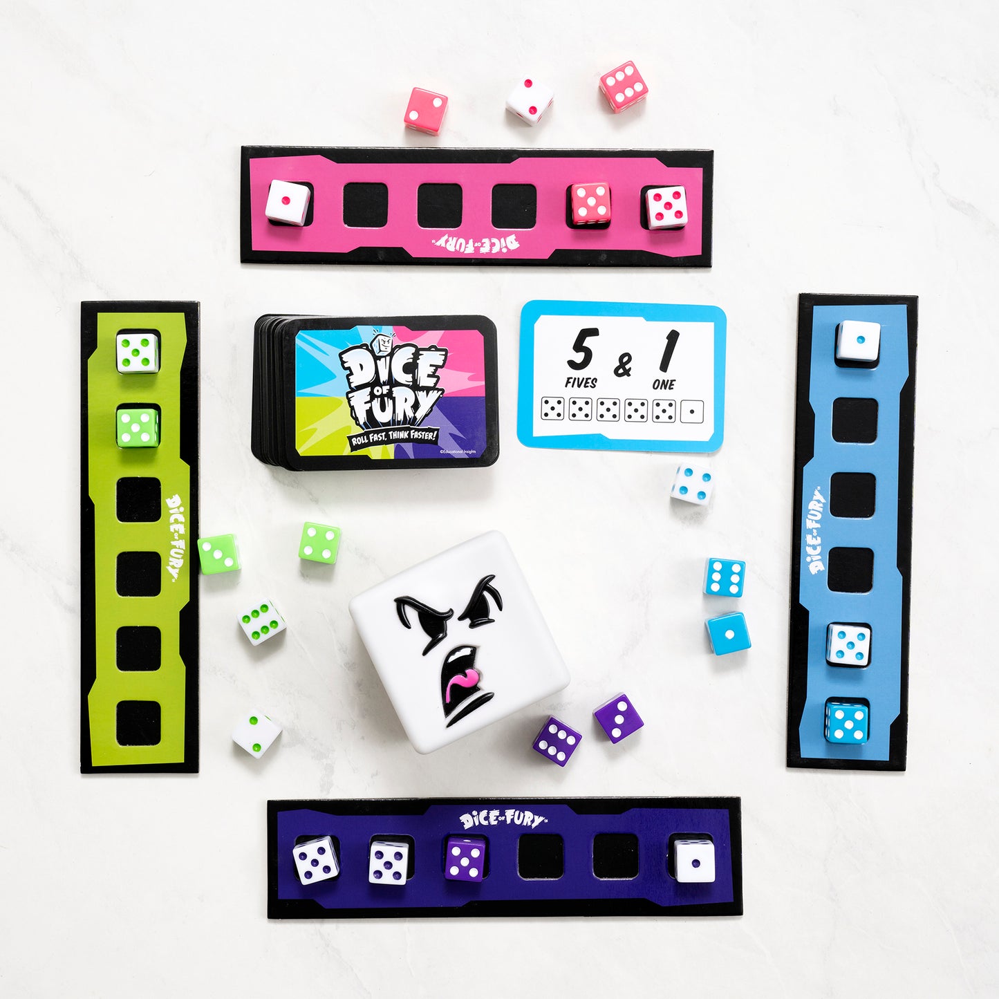 - Includes 24 dice, 80 challenge cards, 4 dice holders, 1 Furious Jumbo Die