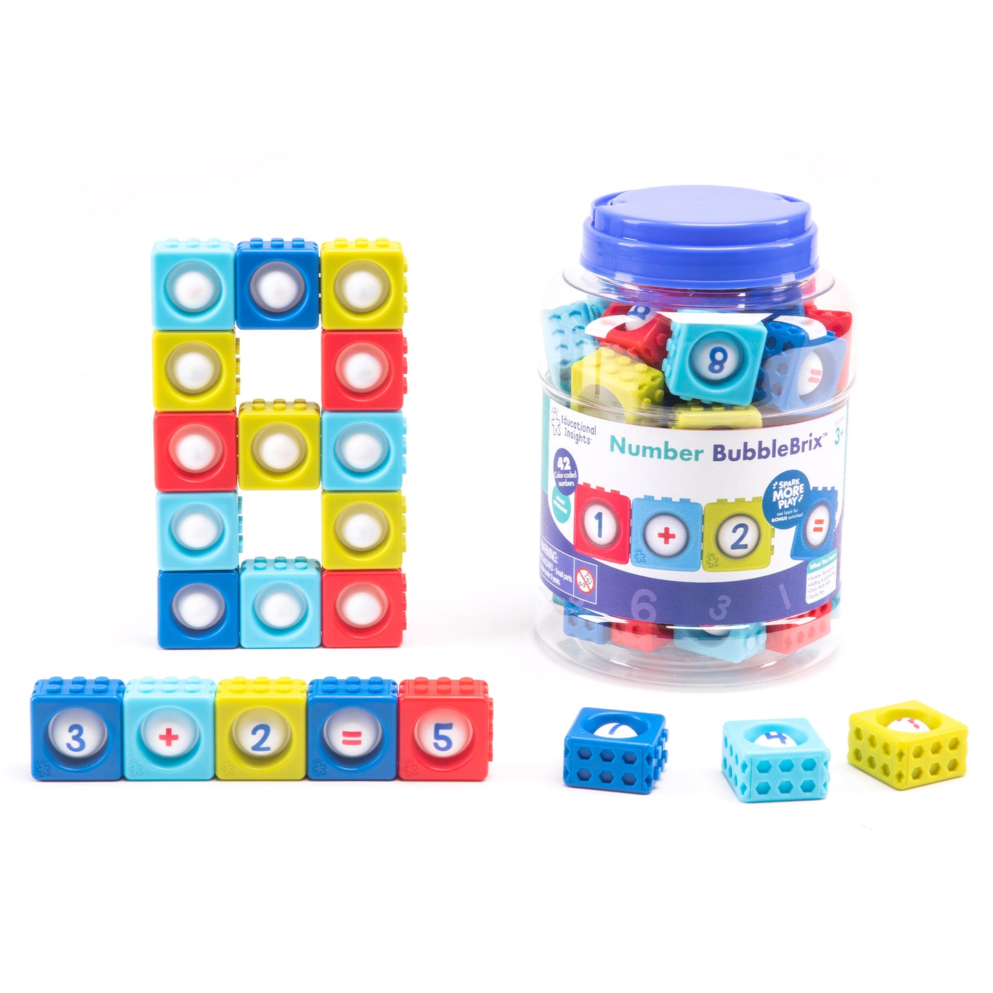 • This set includes 42 Number BubbleBrix and mathematical symbol blocks in a handled storage bucket and an activity guide packed with math activities
