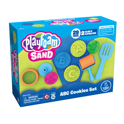 • INCLUDES: Two colors of soft, moldable Playfoam Sand, cookie cutter, handy roller, spatula, and 26 letter stamps, each with an image of an object that begins with that letter sound