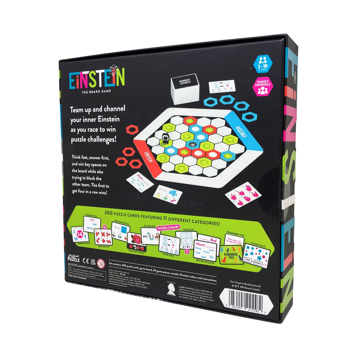 Channel your inner genius with Einstein: The Board Game, where quick thinking meets fun for the entire family! Pit your wits against friends and family as you dive into a thrilling race to capture four winning spaces in a row. Navigate through mind-bending puzzles and block your opponents to claim victory with over 300 captivating puzzle cards spanning 11 eclectic categories.
