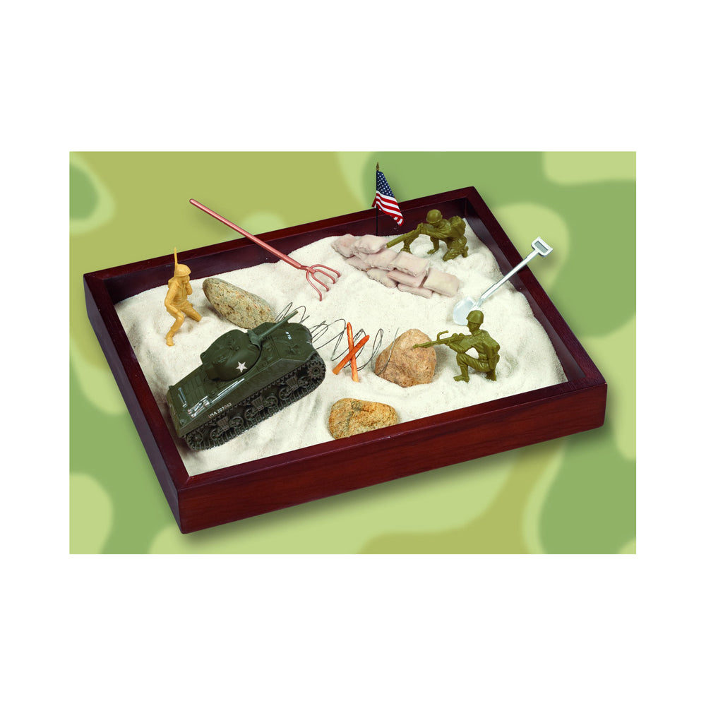 Shake, rattle, and reminisce about the greatest battles in history with the Executive Deluxe Sandbox - Normandy Beach, a unique desktop novelty that brings the iconic D-Day battle right to your office. This meticulously crafted set includes a handsome hardwood sandbox filled with pearl white sand, setting the stage for strategic play or contemplative relaxation. It comes complete with miniature soldiers, a U.S. flag, a die-cast tank, barbed wire, mini sandbags, and grooming tools, allowing you to recreate the historic Normandy Beach battle in a serene or strategic manner. Perfect for history buffs and military enthusiasts, this sandbox serves as both a decorative piece and a functional stress reliever.
