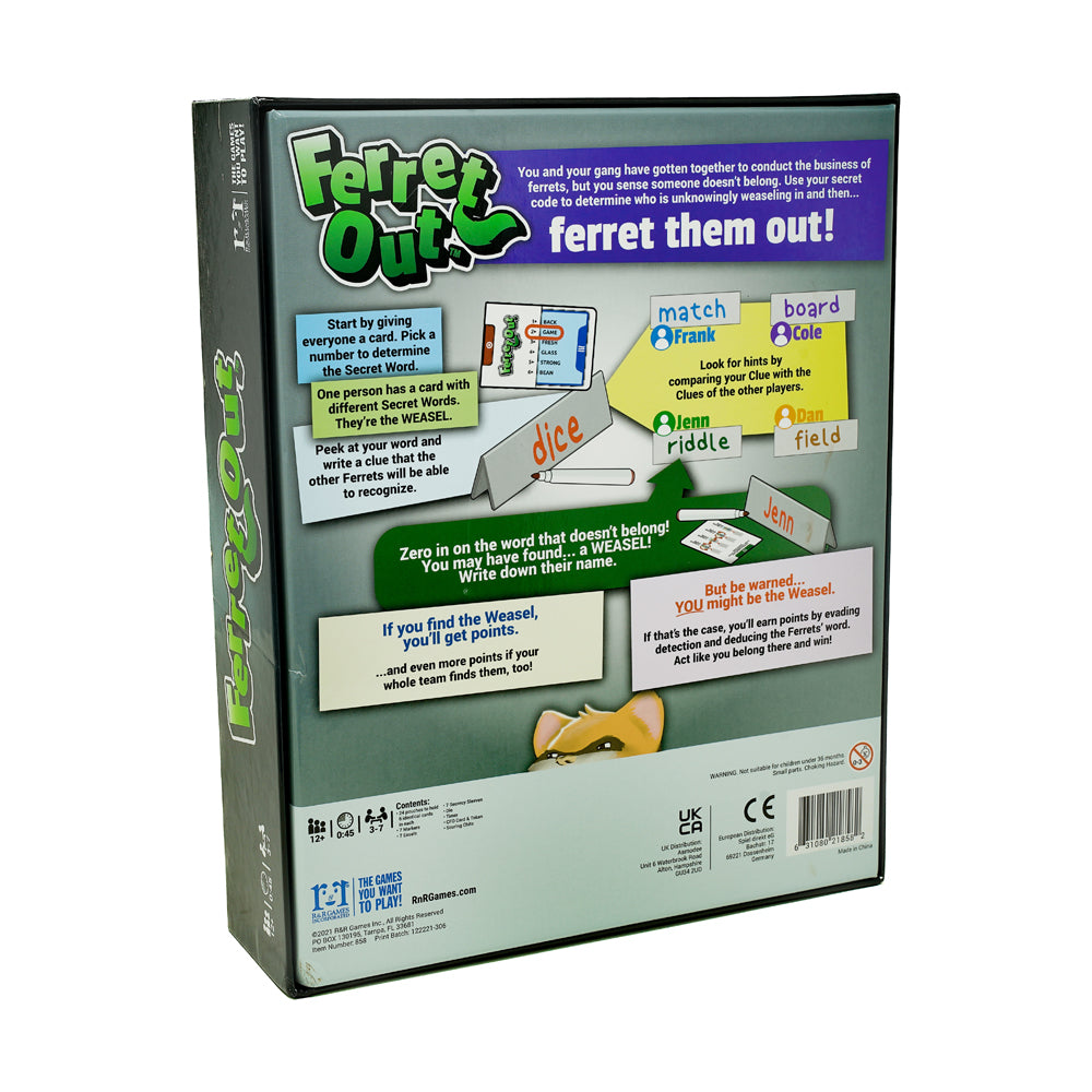 Prepare to dive whiskers-first into a whirlwind of wily heist-catching with Ferret Out, the thrilling board game where players use secret codes and clever deduction to uncover the Weasel among them. Each round of the game involves four exciting steps: Peek, Hint, Guess, and Score, making it a dynamic and engaging experience. The Chief Ferret Officer (CFO) sets the stage each round by determining the secret word, challenging players to think creatively as they write one-word clues to reveal the Weasel's identity without being too obvious. Perfect for game nights, Ferret Out encourages strategic thinking and social interaction.