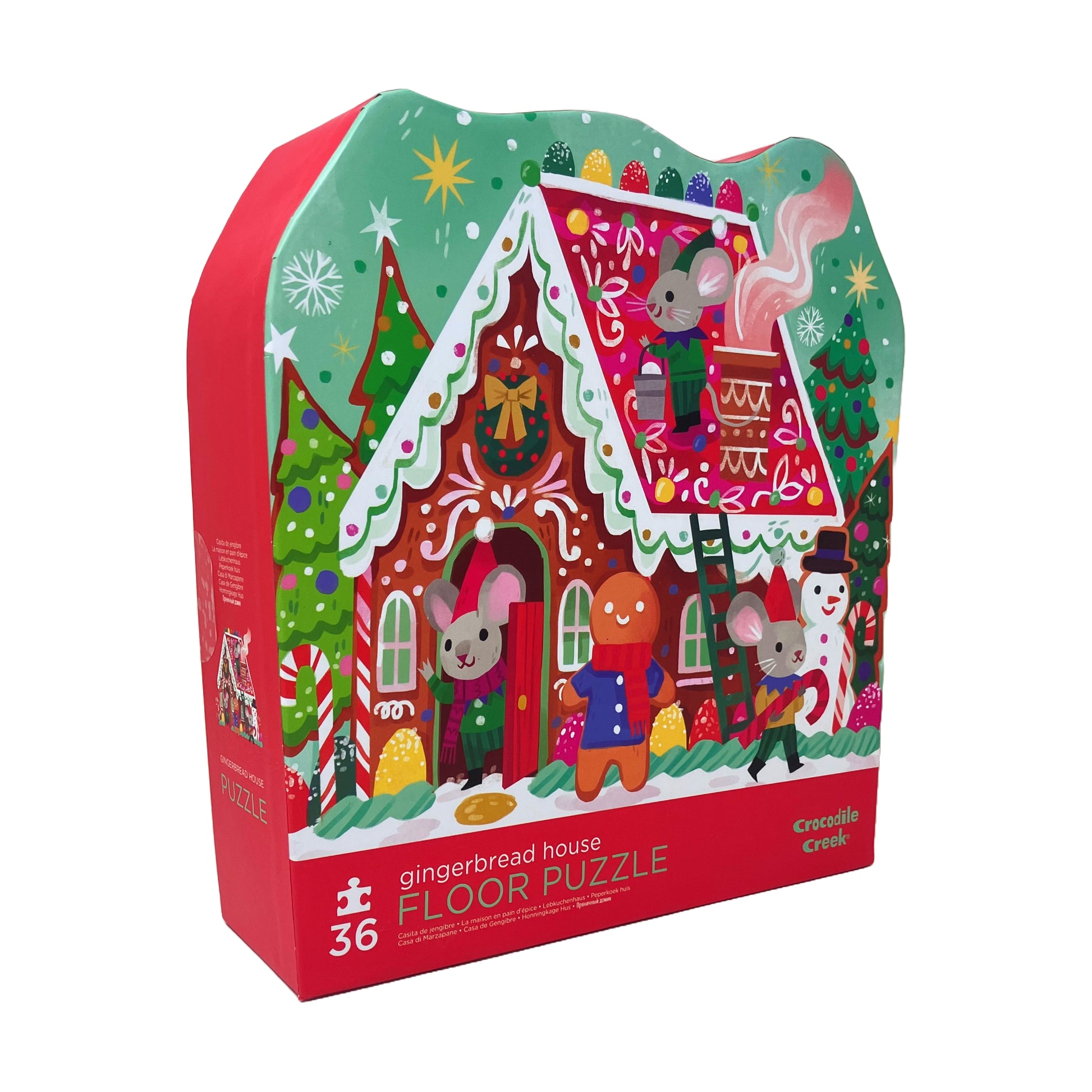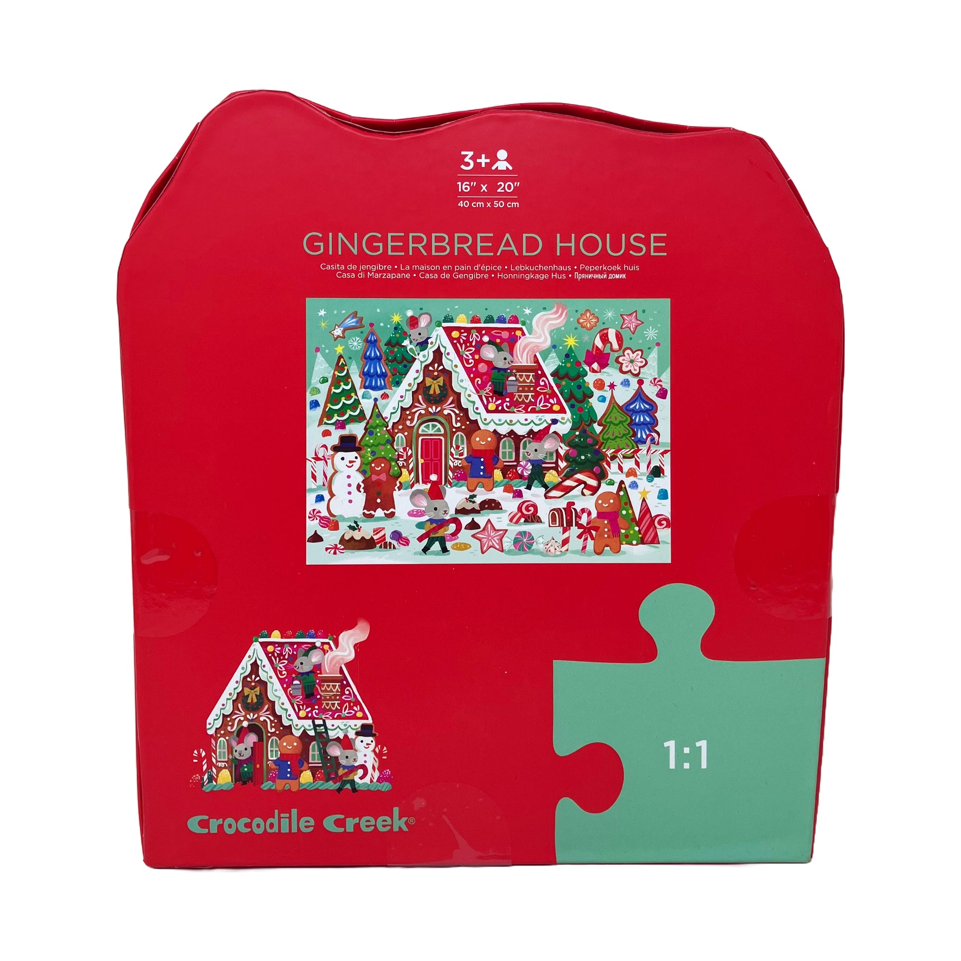 The Crocodile Creek Gingerbread House Floor Puzzle features: