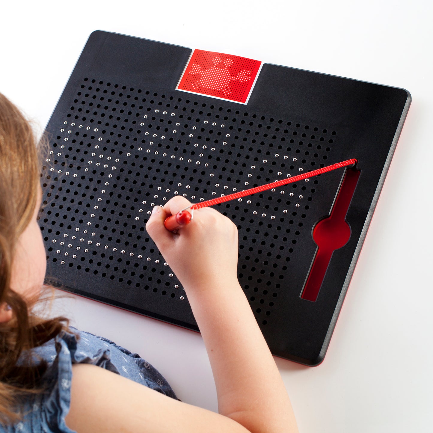 Get your creative groove on with the Guidecraft Magna Tablet! This innovative drawing board uses a magnetic tip pen to attract metal balls, allowing children to sketch and draw intricate designs effortlessly. Simply push the metal balls down to erase and start anew. It's a perfect tool for fostering creativity and enhancing fine motor skills in young artists aged 3 and up.