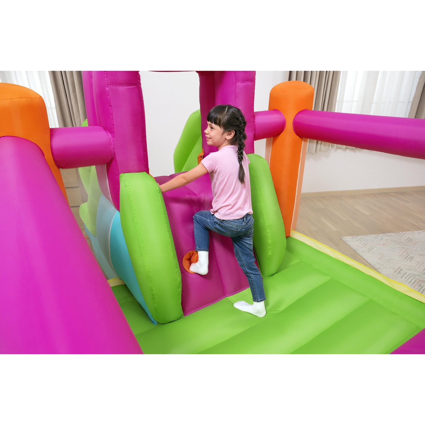 Bounce into a universe of fun with the H2OGO! Mega Bouncer - Slide Flyer - 10'11" x 6' 6" x 6' - Inflatable Jumping Activity Center, perfectly tailored for energetic youngsters aged 3 and up! This colorful inflatable paradise transforms your backyard or living room into the coolest play zone where little adventurers can jump, climb, and slide their way to happiness. With its sturdy construction and quick inflation system, this bouncer is set up in no time, inviting kids to enjoy endless active play. Watch with a smile as your kids exhibit bursts of laughter and physical prowess, all within the safe confine of mesh sidewalls that offer superb visibility.