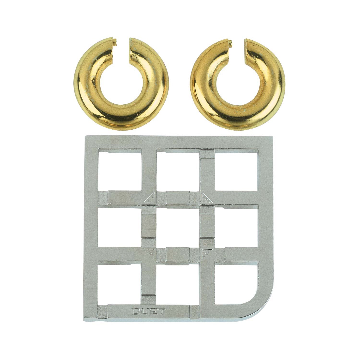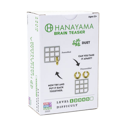 Tangle and untangle the enigma with the Hanayama Level 5 Cast Puzzle - Duet, your next puzzling adventure in metal! Perfect for analytical minds aged 12 and above, this beautifully designed brain teaser will have you at the edge of your seat. It may look simple with what seems to be one lonely ring hanging from its intricate metal grid, but don’t be fooled; there lurks a pair of rings, bound by a magnetic mystery waiting for you to unravel them.
