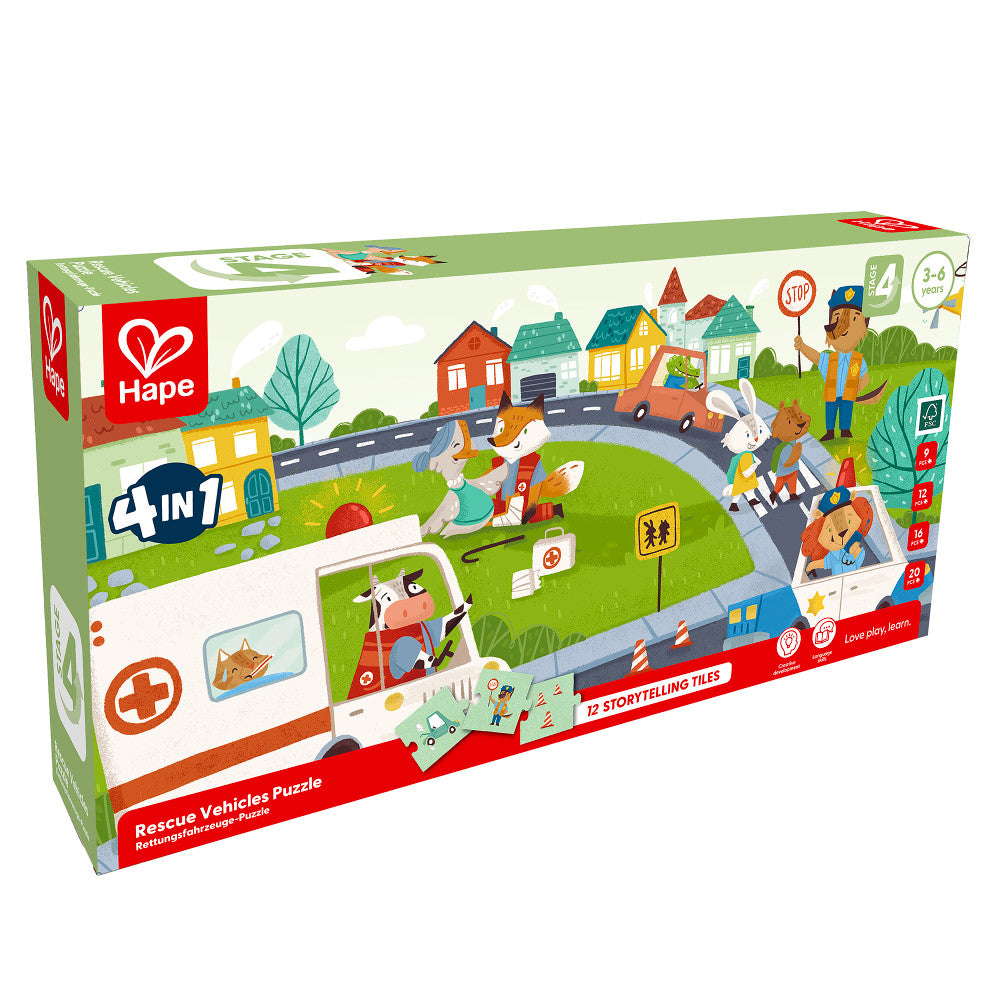 The Hape Colorful Rescue Vehicles 4-in-1 Puzzle Set features: