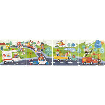 Assemble a world of heroic rescues with the Hape Colorful Rescue Vehicles 4-in-1 Puzzle Set! This captivating puzzle collection is designed to challenge and engage young minds as they piece together each colorful scene of emergency adventures. With four different puzzles varying in complexity, your child can progress in their puzzle-solving skills while enjoying the vibrant illustrations of rescue operations.