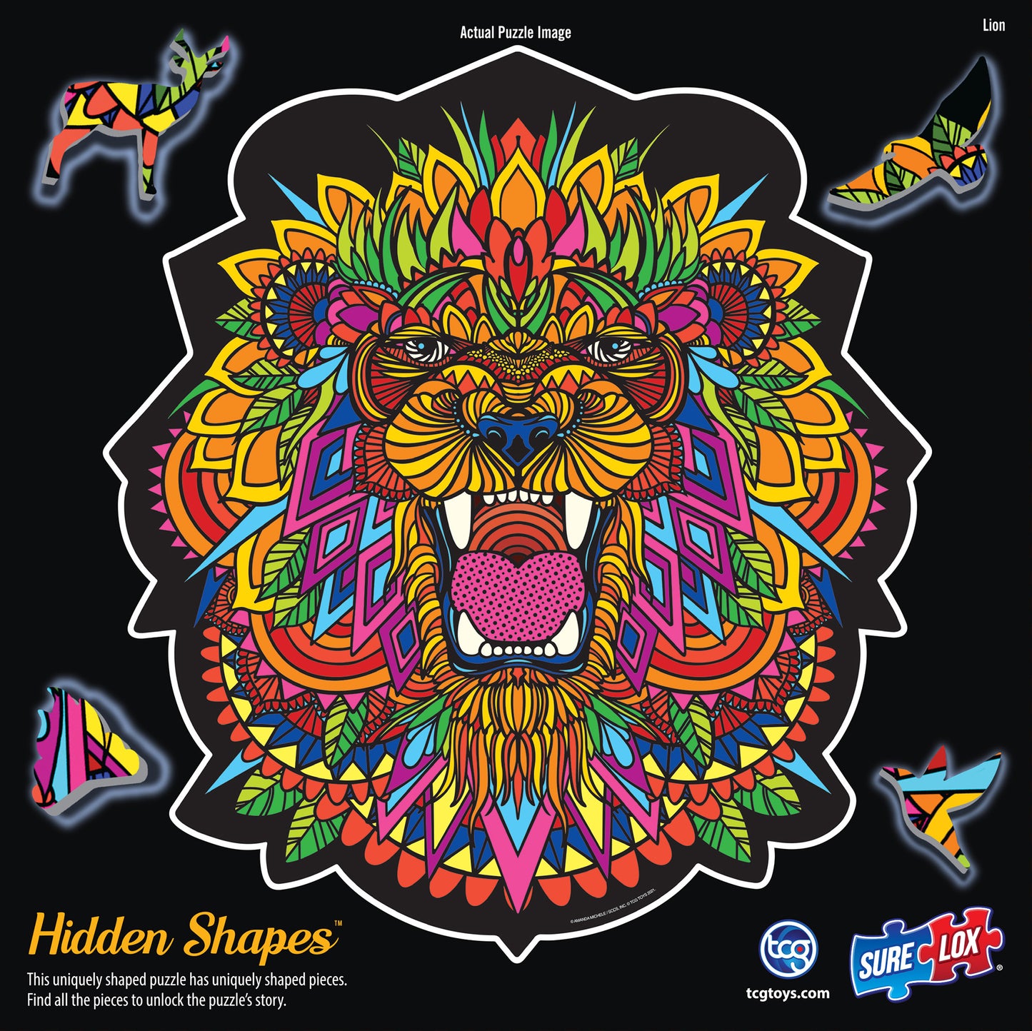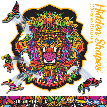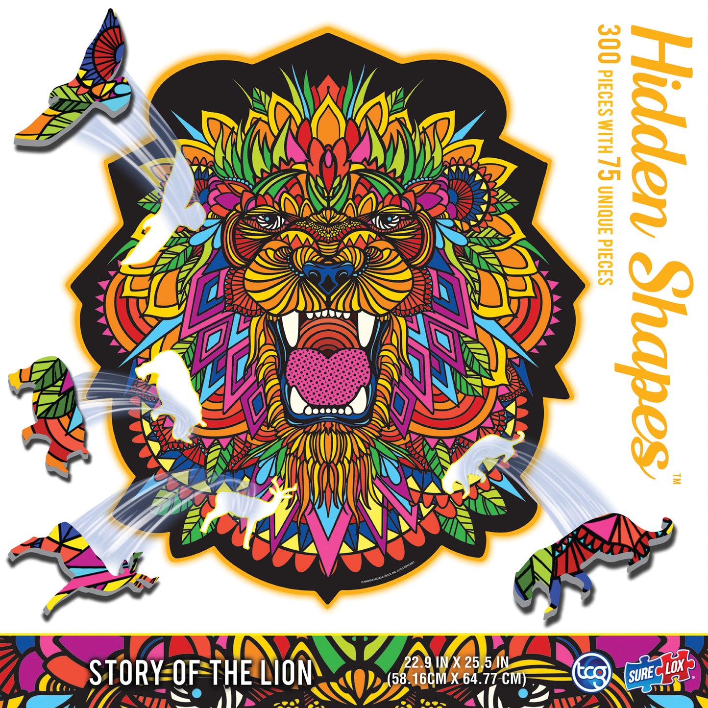 Roar into the jungle of creativity with the HIDDEN SHAPES PUZZLE - LION! This masterpiece draws puzzle enthusiasts into a world of awe with its unique lion silhouette and vivid imagery. With 300 pieces, including 75 distinct hand-drawn shapes, this puzzle not only challenges but tells the mighty story of the lion as you piece it together. At a grand size of 23" x 26", it is an enthralling puzzle experience that brings the king of the jungle to life right in your living room!