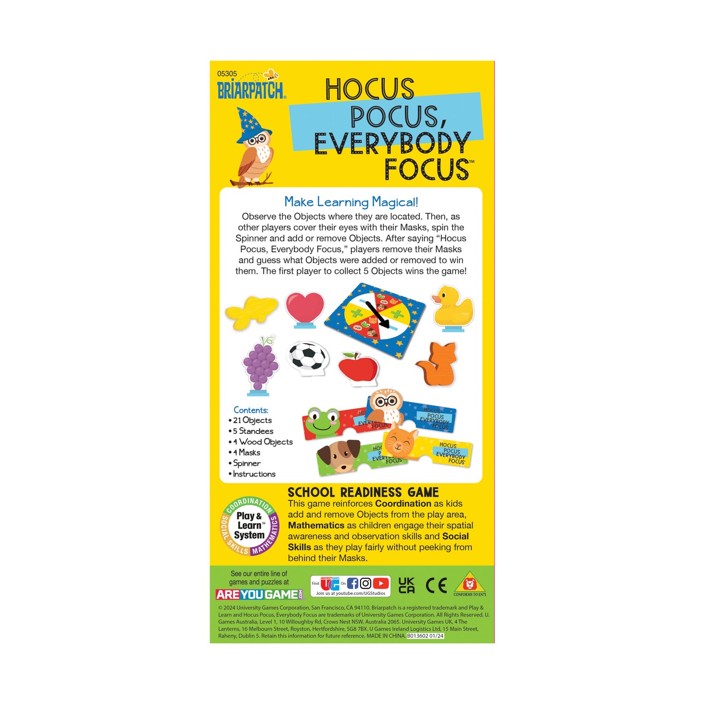 Hocus Pocus, Everybody Focus - the spellbinding game from Briarpatch that transforms learning into a magical adventure! Perfect for ages 3+, it enhances focus, memory & social interaction with masks, spinner & playful objects. Be the first to spot changes & collect 5 objects to win! Portable size makes it ideal for travel. Get ready for magical giggles & challenges - shop now on toysrus.com!