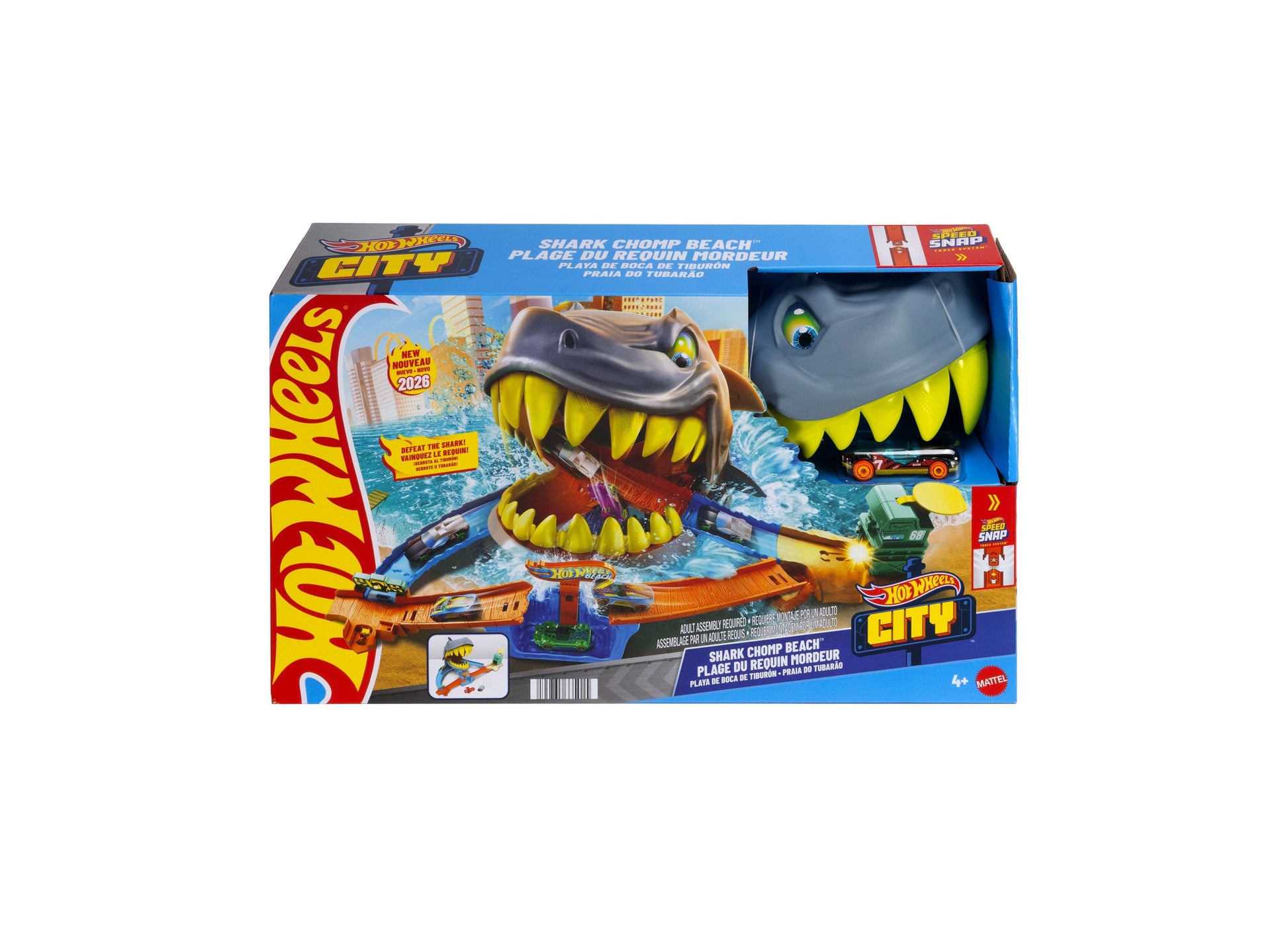 Splash and crash through exciting adventures with the Hot Wheels City Shark Chomp Beach Playset! Perfect for young thrill-seekers, this beach-themed playset features a daring shark that chomps down as cars race by. Watch out, or your Hot Wheels might just get bitten by the ferocious shark lurking in the waters! Set up is easy, so kids can get to playing right away, launching their favorite Hot Wheels through loops and over jumps to escape the shark's giant jaws.