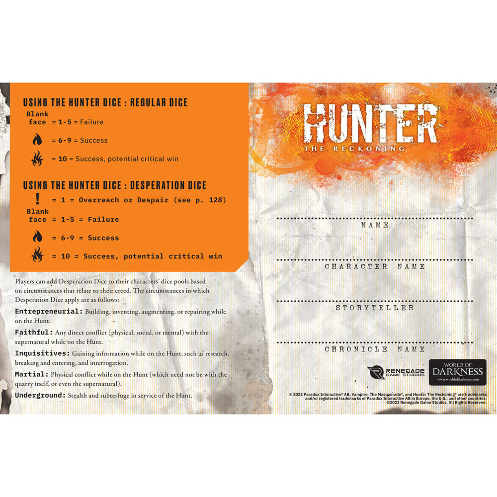 Get ready to dive headfirst into the dark and thrilling universe of Hunter: The Reckoning 5th Edition Roleplaying Game with this indispensable Expanded Character Sheet Journal. Crafted to enhance your gameplay, this linen-look hardcover journal is your ultimate companion on a journey to confront the hidden monsters. With enriched character sheets and history pages, every daring encounter and narrow escape is meticulously chronicled, turning every game session into a vivid epic.