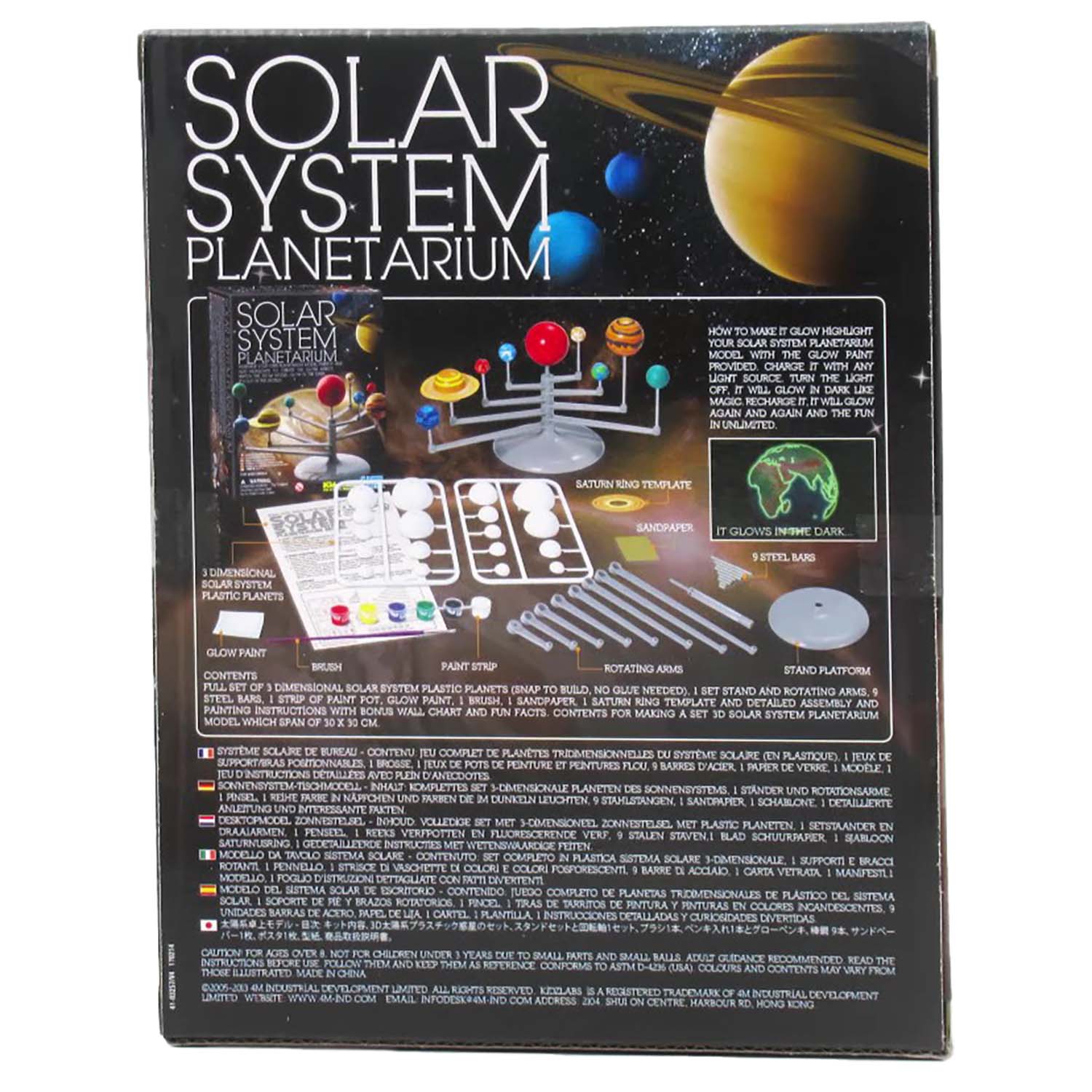 4M: SOLAR SYSTEM PLANETARIUM - Embark on an Out-of-This-World Adventure with the Solar System Planetarium! This exciting kit includes a complete set of plastic planets that snap together—no glue needed—along with a stand featuring rotating arms embossed with the distance from the sun for each planet, providing an interactive learning experience. Children can unleash their creativity as they paint each planet and add highlights to create a mesmerizing glow effect, transforming their model into a captivating night sky exhibit. The Solar System Planetarium has a spannable size of 11.8 inches, making it a striking addition to any space, and additional glow paint is included for highlights, allowing it to glow in the dark, drawing attention and sparking curiosity about the cosmos. Additionally, the kit provides fun facts about each planet and the solar system, enriching the educational experience and encouraging aspiring astronomers to learn more about the universe. The rotating arms not only enhance the model's dynamic display but also allow kids to visualize the distances between planets. This interactive kit is perfect for both craft enthusiasts and science lovers, making it an ideal project for home or school. It fosters creativity while enhancing scientific understanding, making learning about space fun and engaging for children of all ages! INCLUDES: Full set of 3-dimensional Solar System plastic planets (snap to build, no glue needed), 1 set stand and rotating arms, 9 steel bars, 1 strip of paint pot , glow paint, 1 brush, 1 sandpaper, 1 Saturn ring template and detailed assembly and painting instructions with a bonus wall chart and fun facts.