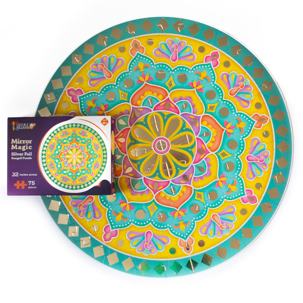 Embark on a dazzling cultural adventure with the Kulture Khazana: Mirror Magic 75pc Floor Puzzle! Watch the shimmering silver foil pieces come to life as you assemble a vibrant 32-inch Rangoli mandala. Perfect for ages 4+, this puzzle promotes fine motor skills, problem-solving, and an appreciation for Indian art. Create a magical masterpiece that sparkles and shines – shop now on toysrus.com!