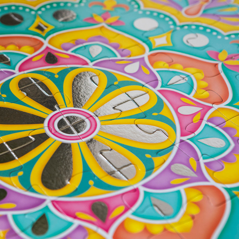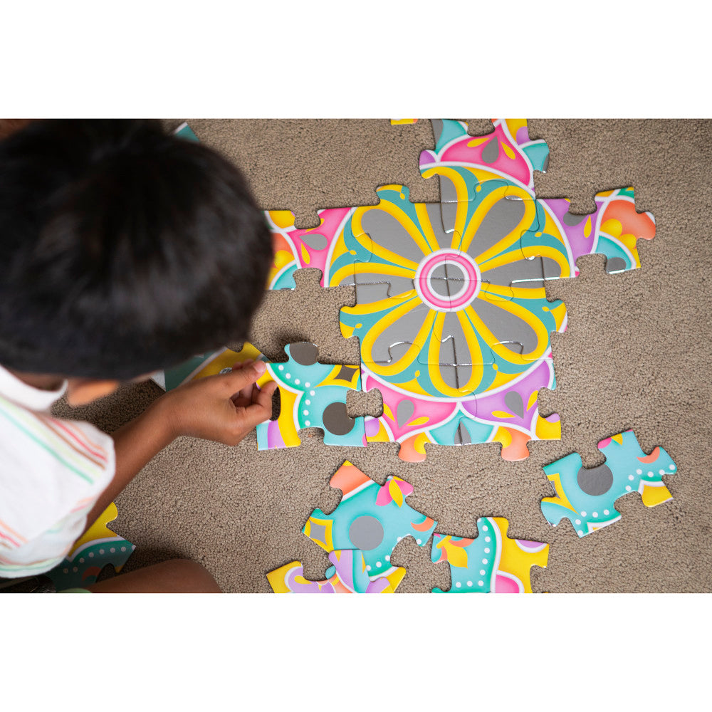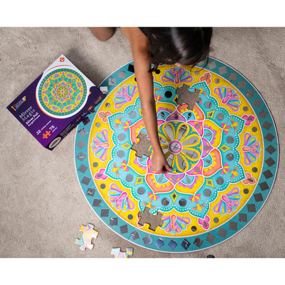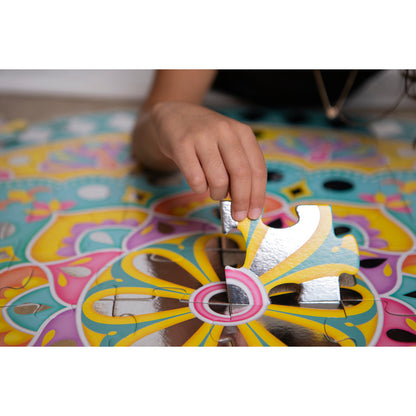 Step into a shimmering world of color and culture with the Kulture Khazana: Mirror Magic - 75pc Floor Puzzle, Kids Ages 4+! This mesmerizing 32-inch circular puzzle brings the brilliance of traditional Indian Lippan art right to your floor. The shiny, reflective silver foil pieces dazzle the eye, making every puzzle session a vibrant festival of hues.