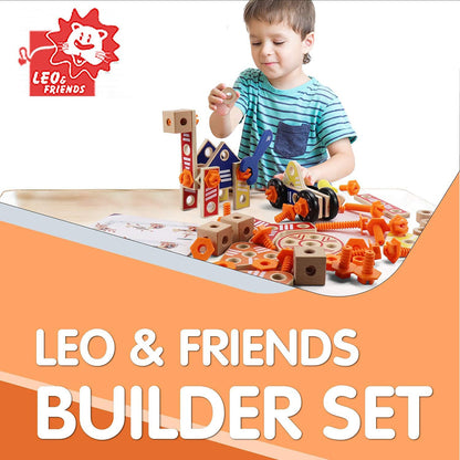 The LEO & FRIENDS Wooden Builder Construction Set features: