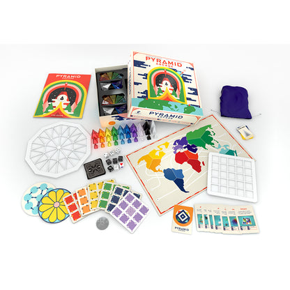 - Includes 90 pyramids, 11 boards, 9 dice, a bag, and 3 decks of cards