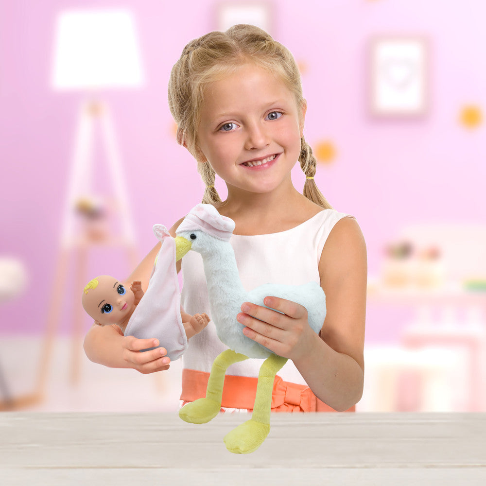Discover the magic of the Magic Nursery 8-inch Special Delivery Set! This posable newborn baby doll comes with a plush stork for endless cuddly fun. Perfect for toddlers age 2+, it includes a diaper and bottle for nurturing play. Shop now on toysrus.com and bring home this delightful baby shower gift!
