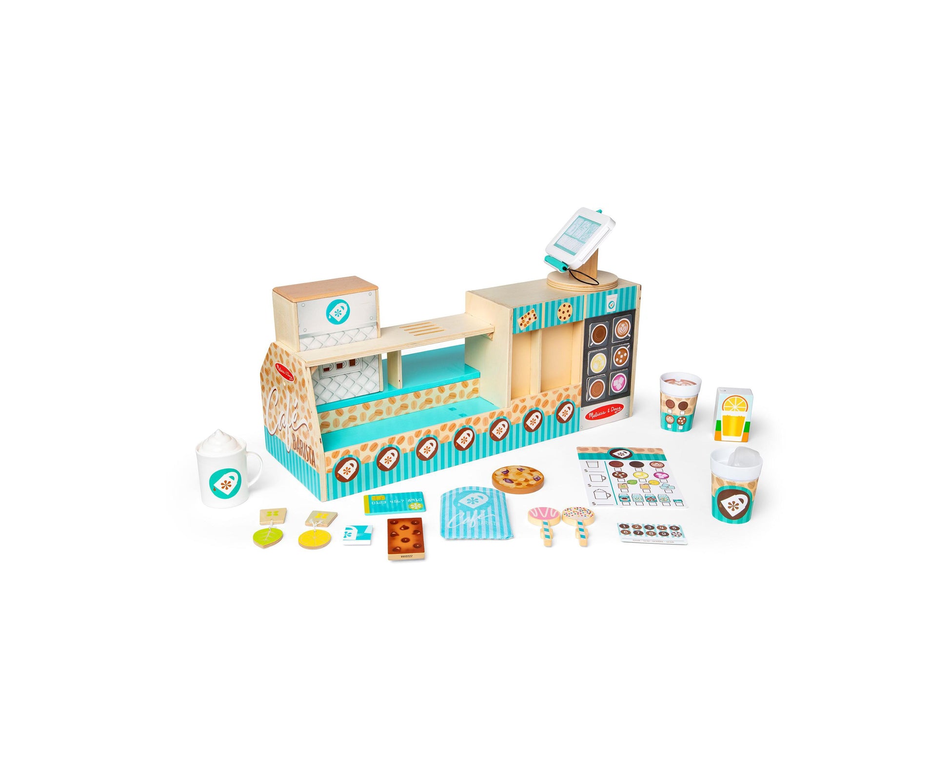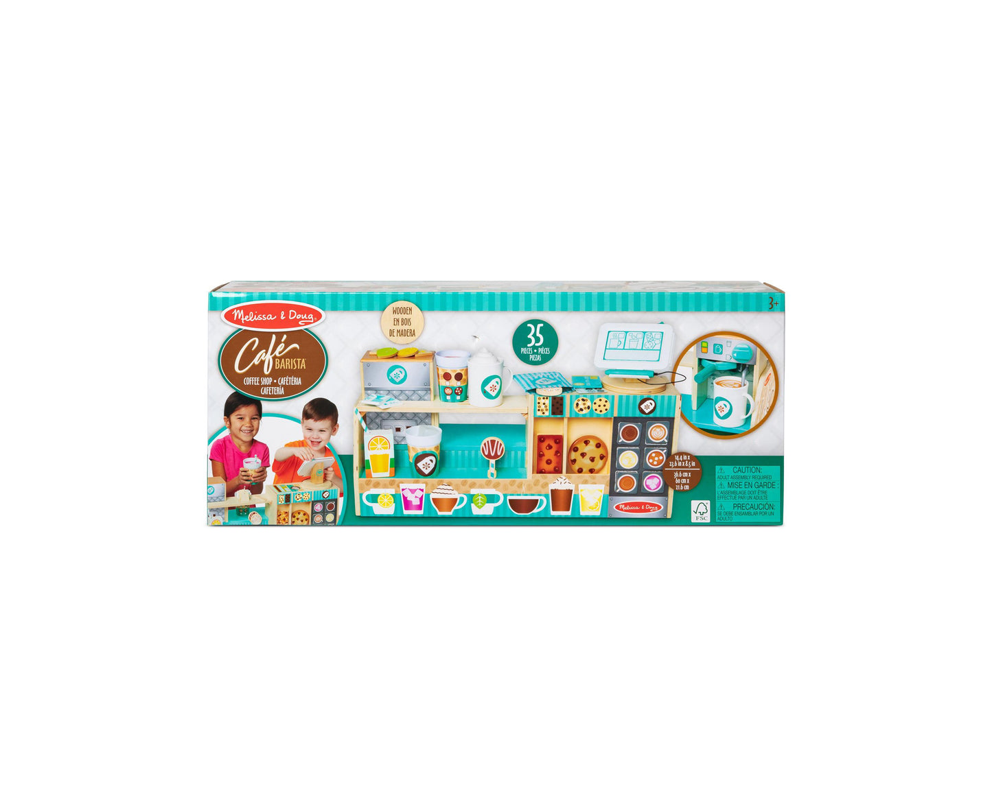 The Melissa and Doug Wooden Cafe Barista Coffee Shop Set features: