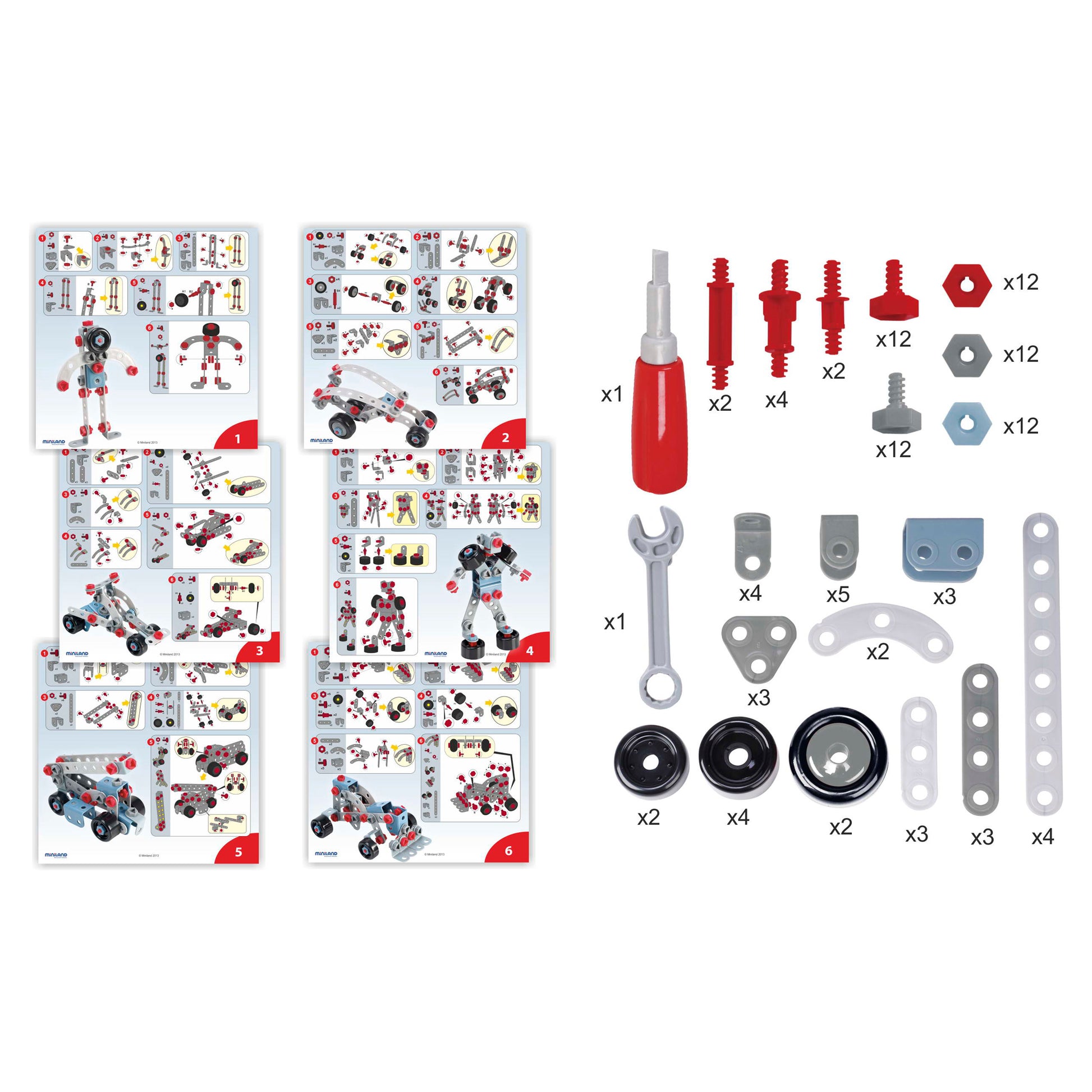 The Miniland Educational Mecatech 106-Piece Vehicle & Robot Building Set features: