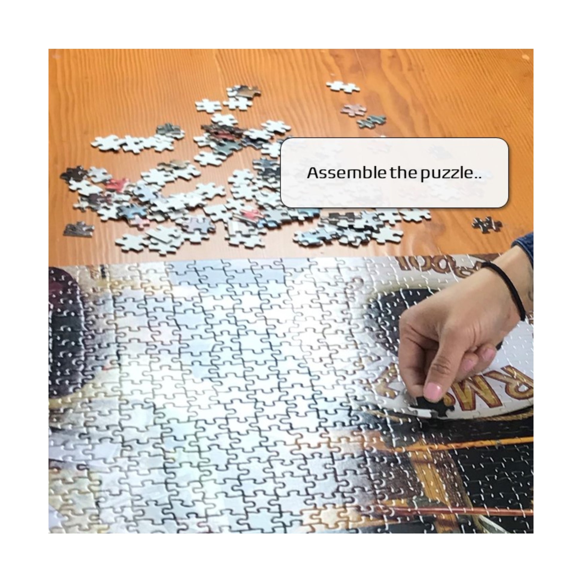 - The puzzle forms a unique scene, different from the box cover