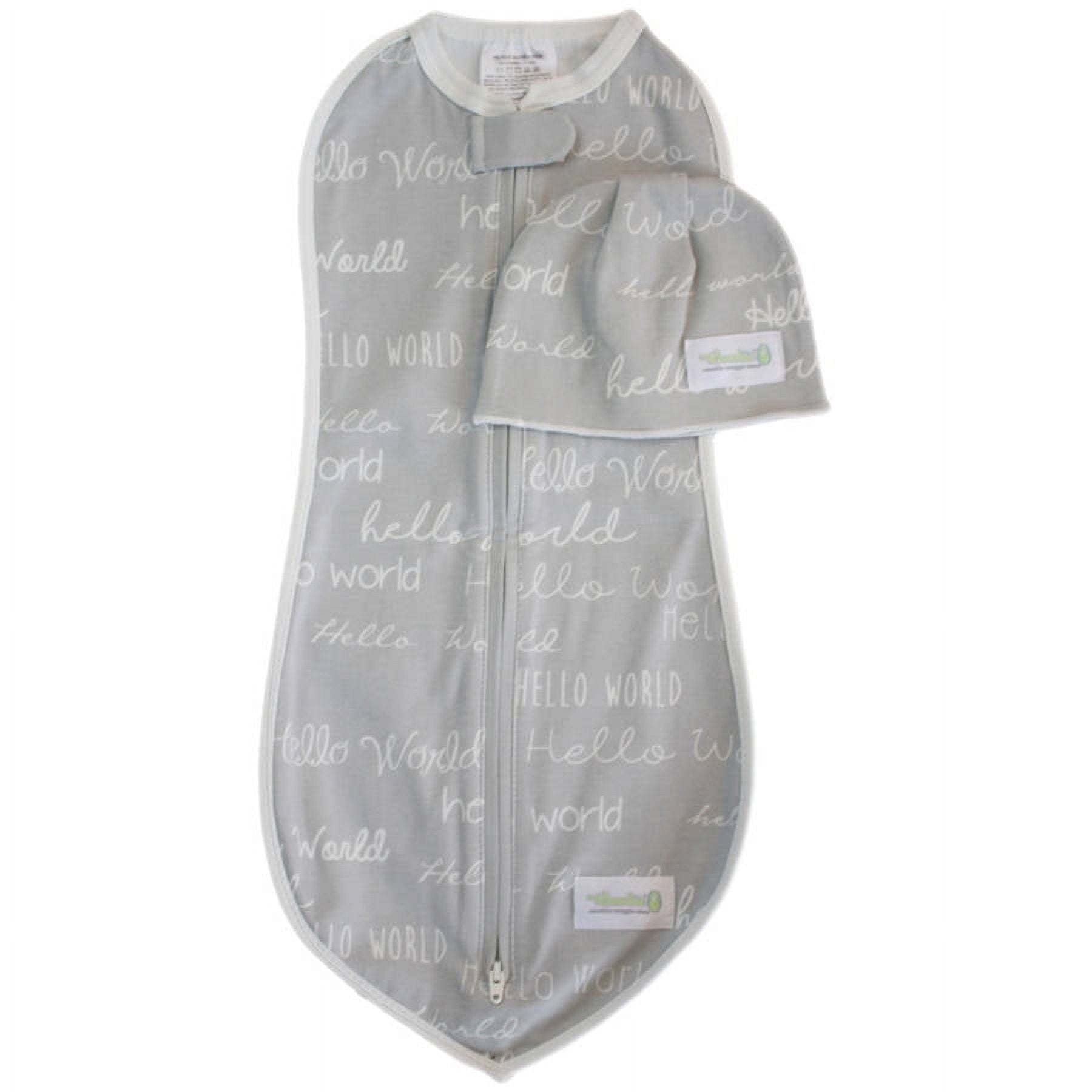 Swaddle your newborn in a cloud of comfort with the My First Months Hello World Grey Swaddle Set. This delightful set not only cocoons your baby in the soothing snugness of our trademark bebeflex fabric but also comes with a charming matching hat to keep tiny heads toasty. The lightweight, breathable, and stretchy material allows gentle movements, making it easier for your baby to transition from womb to world in comfort and style.