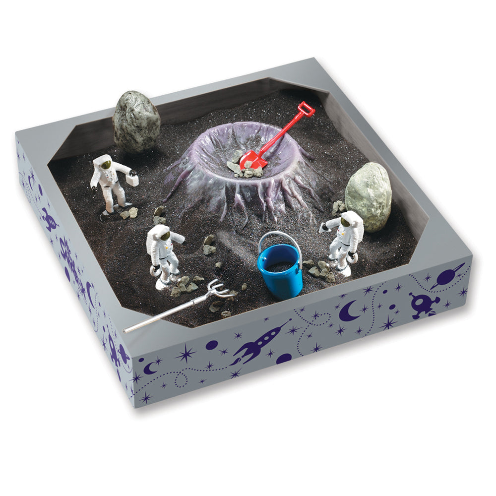 - Includes 3 astronauts, crater, digging shovel, grooming rake, collection bucket, 2 asteroids, and moon rocks.