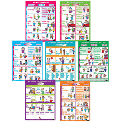 - Seven large, colorful posters each focusing on different irregular verb groups.