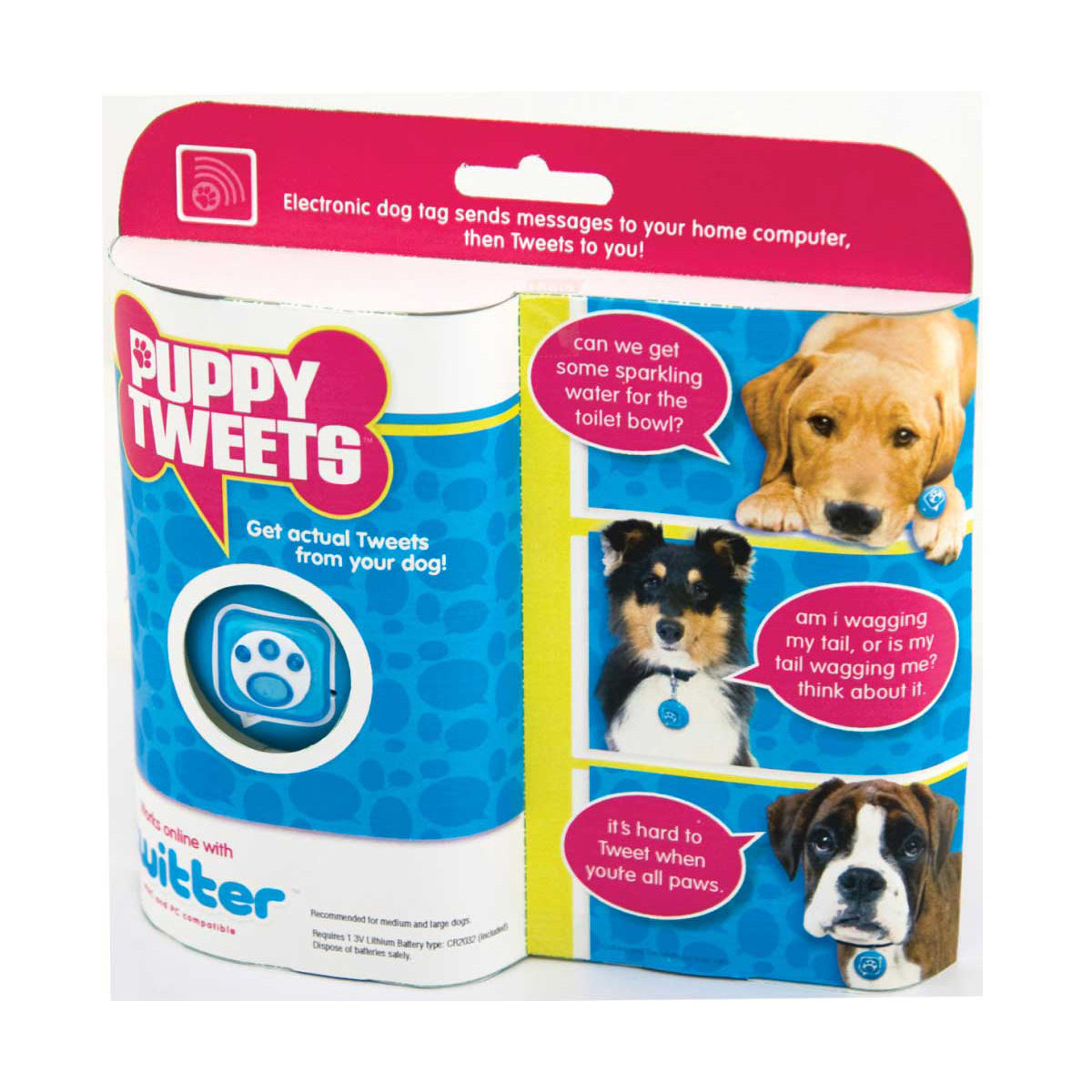 Discover your dog's secret life with Puppy Tweets: Blue! This witty electronic dog tag transforms barks into hilarious tweets, keeping you entertained all day. With 500+ pre-loaded phrases, you'll never miss a moment of your pup's antics. Easy to use with Mac or PC, it's the perfect gift for pet lovers ages 13+. Shop now on toysrus.com and unleash the laughter!