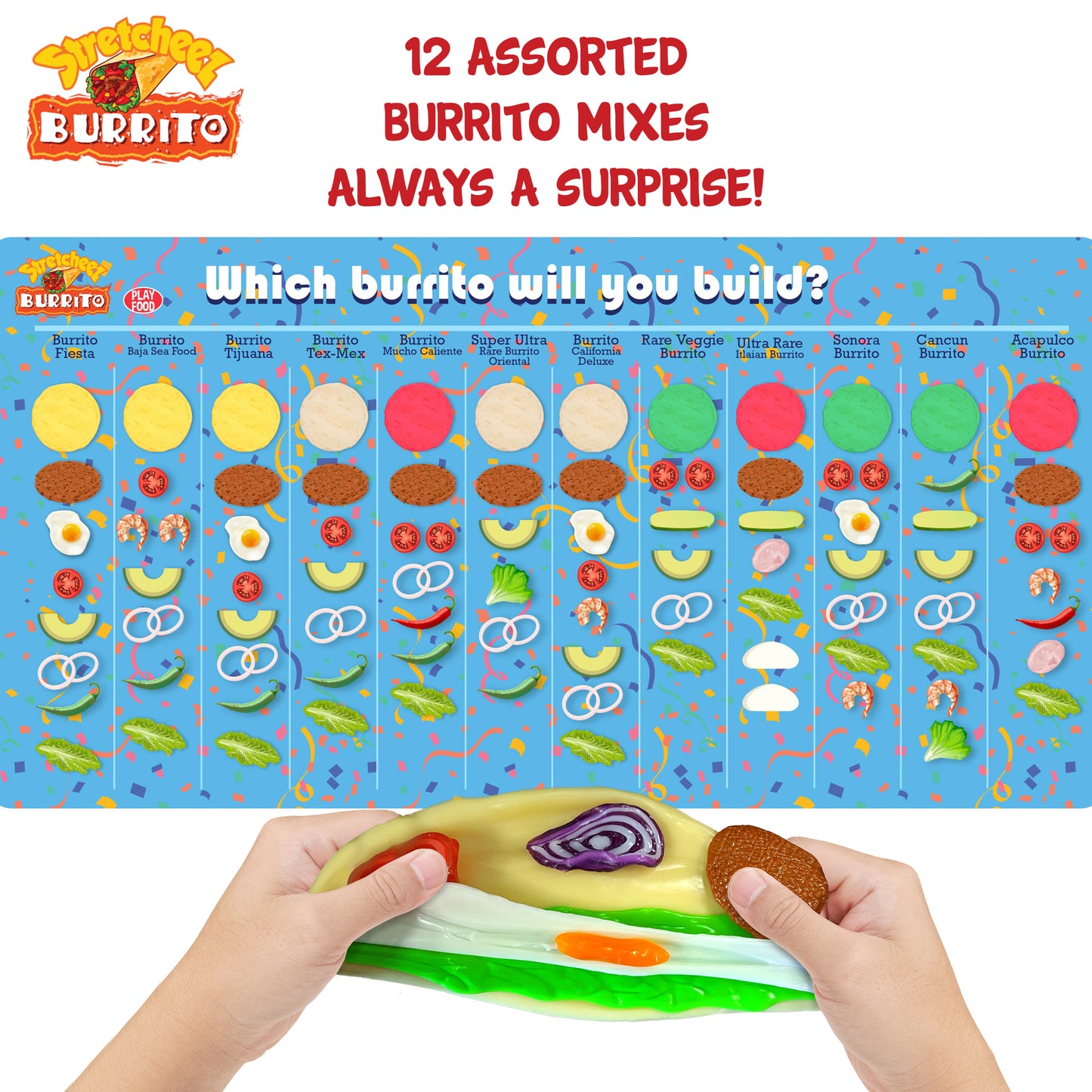 - Includes stretchable burrito wrap and surprise mix-and-match toppings.