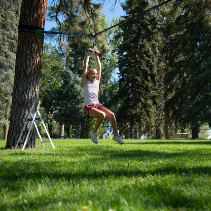 Soar through the air with the Treslines Roller Adventure Line 36 ft - Zipline with Grip Bar Handle! Designed for the young and young at heart, this backyard zipline kit transforms your outdoor space into a thrilling adventure park. Glide smoothly between two sturdy trees and feel the breeze as you zip from start to finish on a robust 2" webbing material line. With an easy setup that only requires a 6' ladder, the fun starts in no time!
