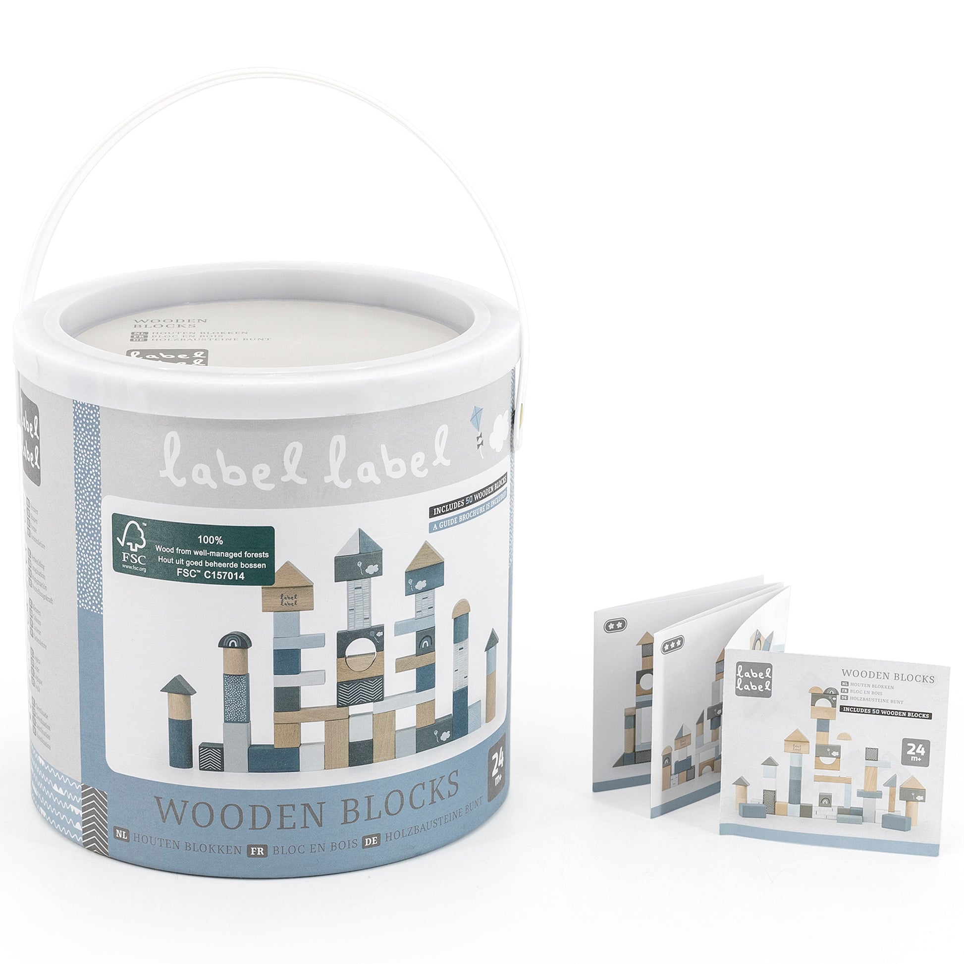 LABEL LABEL: WOODEN BLOCKS 50PCS - BLUE - The Label Label Wooden Blocks set is thoughtfully crafted from high-quality, FSC-certified beech wood, ensuring both durability and sustainability. This 50-piece set includes a combination of natural wooden blocks and colorful blocks, each painted with child-safe, water-based paints in soothing nougat, white, and grey shades. These pastel colors and smooth finishes make the blocks both visually appealing and safe for young children. Each block in the set features various shapes, sizes, symbols, and patterns, offering endless possibilities for building, stacking, and imaginative play. The blocks come neatly packaged in a convenient storage box with a handle, making them easy to store and carry for playtime at home or on the go. Additionally, the set includes a booklet with creative building ideas to inspire your child's imagination and encourage creative problem-solving. As children build and stack with the blocks, they develop fine motor skills, spatial awareness, and hand-eye coordination. The open-ended nature of the set also stimulates creativity and helps strengthen cognitive abilities as kids explore different ways to arrange and combine the blocks. Ideal for toddlers and children ages 2 and up, the Label Label Wooden Blocks set is the perfect addition to any playroom, promoting hours of educational fun and imaginative development. INCLUDES: 50 wooden blocks that store away in the included box.