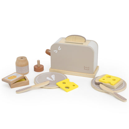 LABEL LABEL: WOODEN TOASTER SET - TAN - Ping! Your little one can now enjoy a delightful breakfast experience with the Label Label Wooden Toaster Set, a beautifully designed playset that brings the fun of making toast into the world of imaginative play. This charming set includes everything your child needs to make a delicious breakfast, with a wooden toaster, two slices of bread, two plates, two slices of cheese, a butter dish, two knives, and a jar of jam, creating a complete breakfast experience. The toaster itself is a fun, interactive piece, featuring a dial that allows your child to set the “time” for toasting, while the lever provides a satisfying “pop!” when the bread is ready. This realistic feature adds an extra layer of engagement and helps develop fine motor skills as your child manipulates the toaster, plates, and accessories. The detailed, child-friendly design of the set encourages imaginative role-playing, allowing your child to serve breakfast to family members or enjoy cooking pretend meals on their own. Made from FSC-certified wood, this durable and toaster set is designed to withstand hours of play while offering a safe and sustainable option for your little one. Ideal for children aged 3 and up, the Label Label Wooden Toaster Set provides an excellent opportunity to develop creativity, social skills, and hand-eye coordination, all while having fun in the kitchen. Dimensions: 7.3 x 3.5 x 4.25". INCLUDES: Toaster, 2 slices of bread, 2 plates, 2 slices of cheese, a butter dish, 2 knives, a jar of jam.