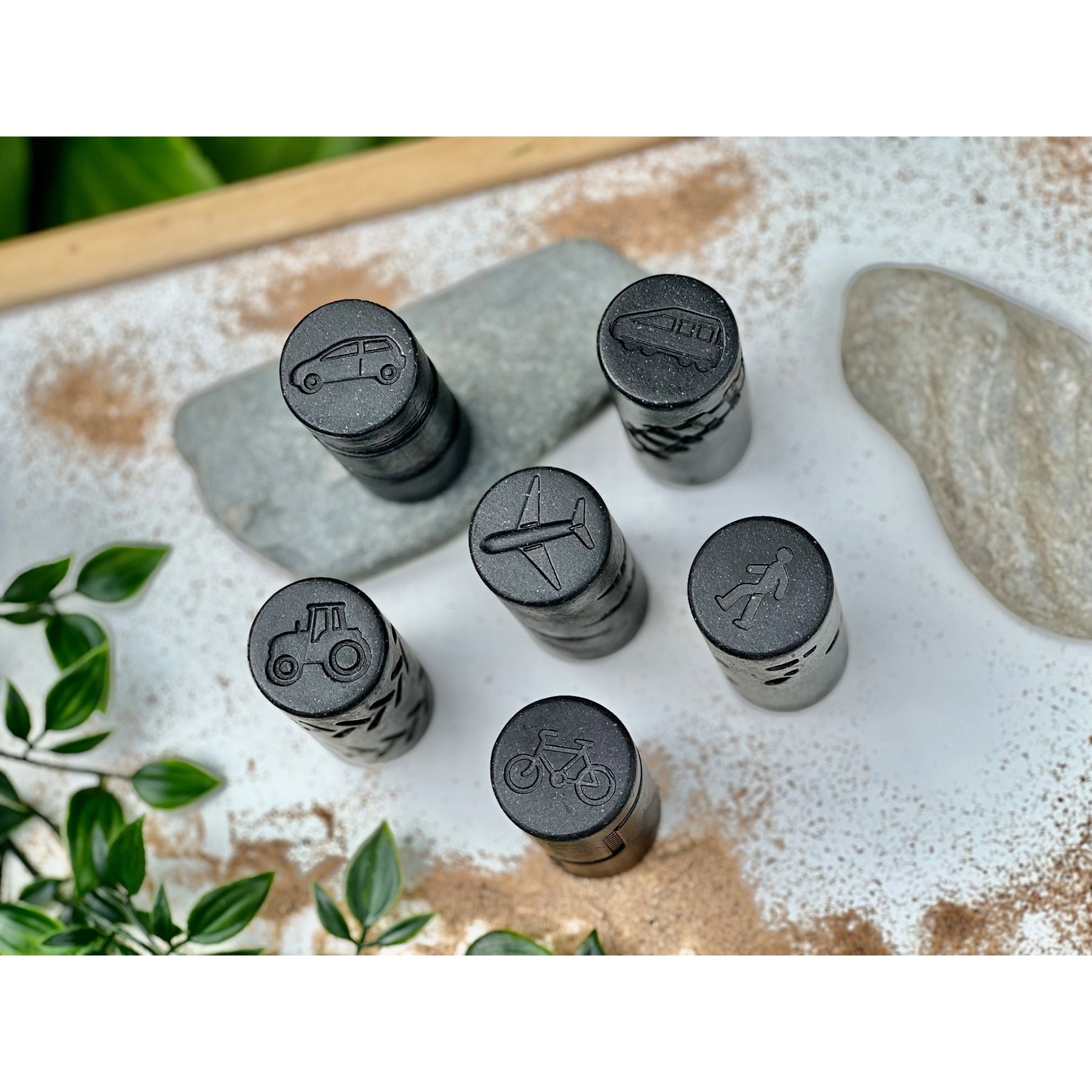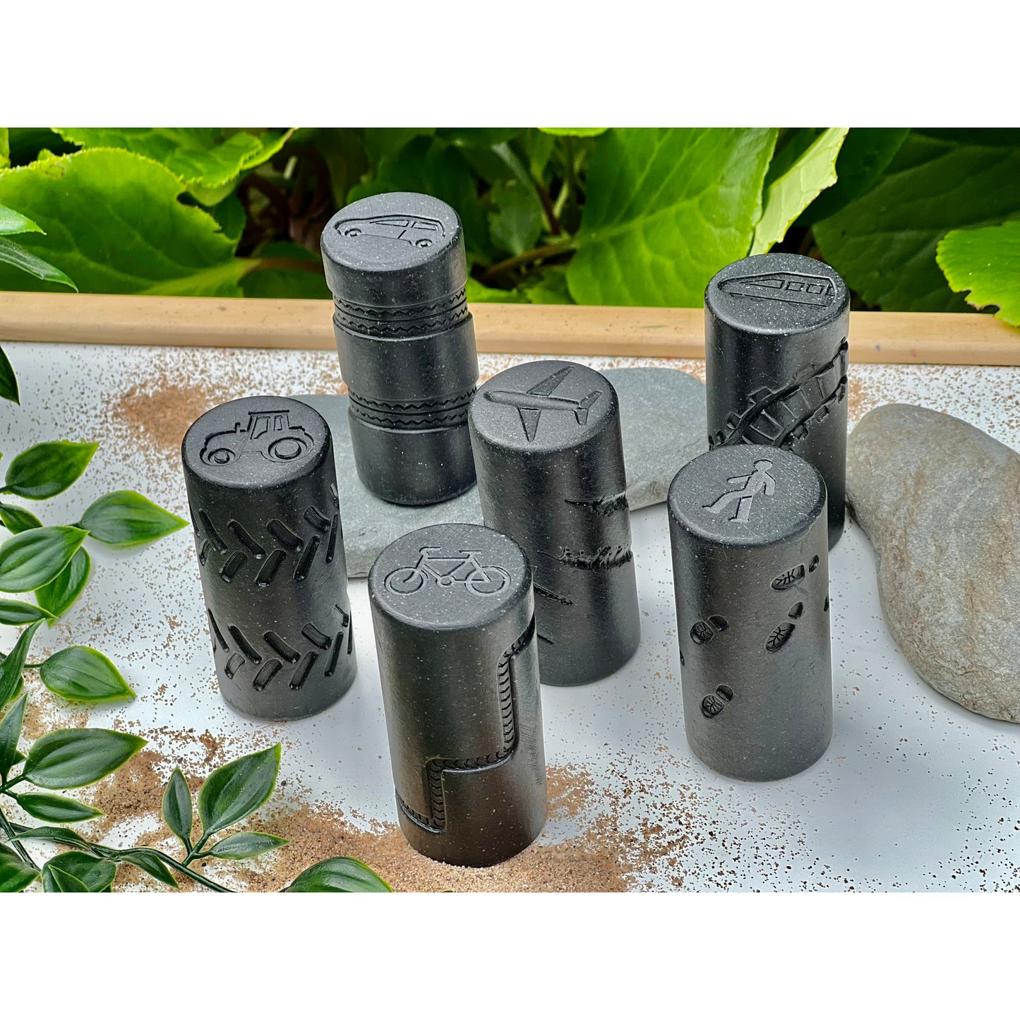 - Intricate transport imprints: train, car, bike, plane, tractor, pedestrian