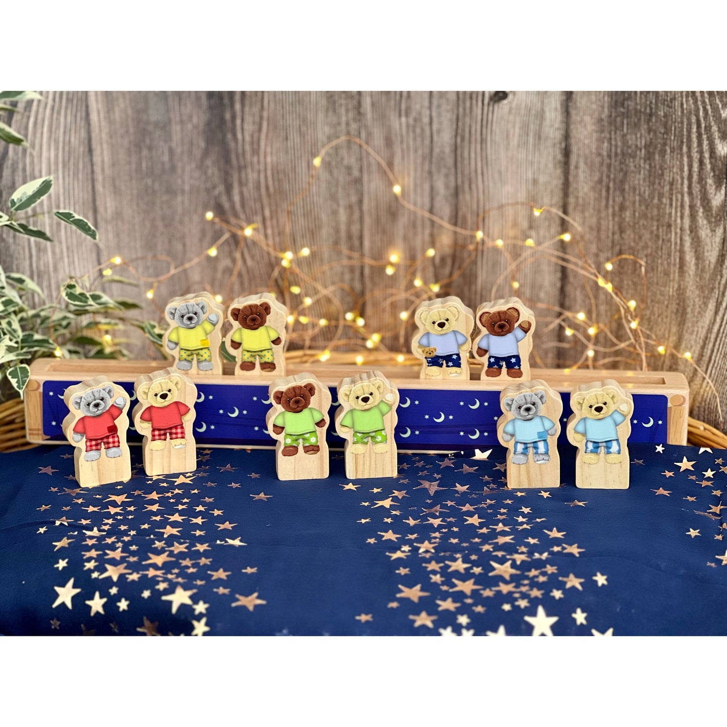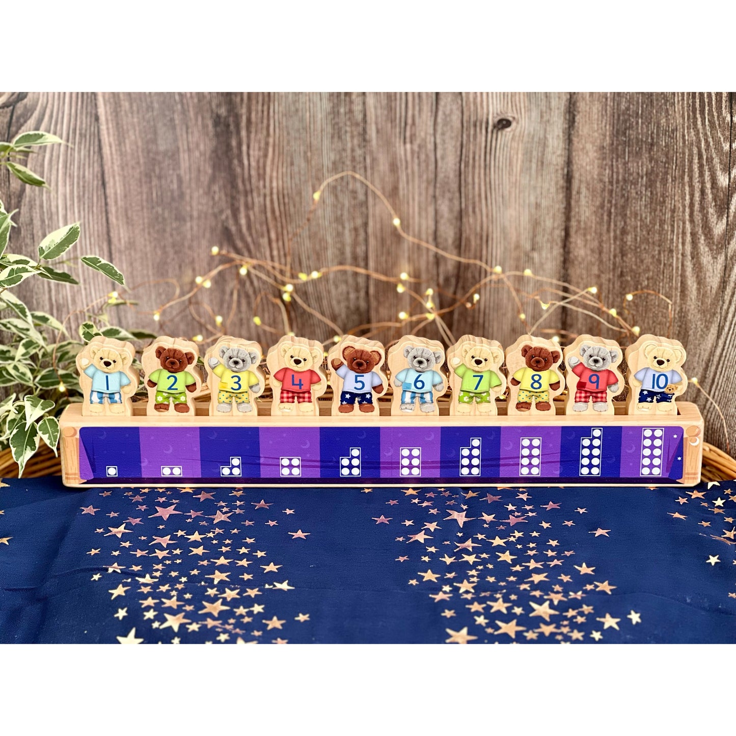 Snuggle up for fun with math! The Yellow Door Ten in the Bed Number Line Tool turns a beloved nursery rhyme into a joyful learning experience. This engaging set is designed to enhance counting skills and introduce the concepts of number sequencing and spatial estimation with a delightful spin. Featuring a sturdy wooden bed base and ten adorable bears, little learners will love organizing their plush playmates and singing along to 'Ten in the Bed' as they develop crucial early mathematics skills.