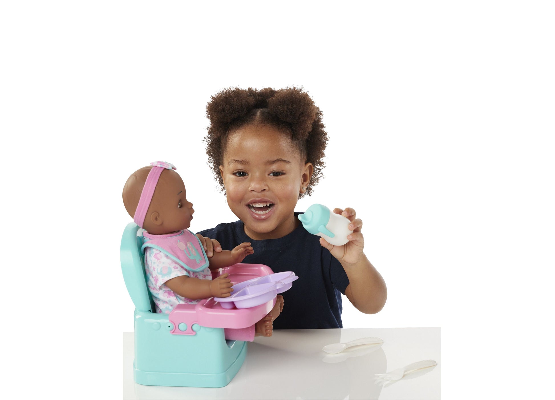 Prepare for a whirlwind of giggles and nurturing fun with the You & Me Hungry Baby 14" Doll, Created for You by Toys R Us. This delightful doll set includes everything needed for a fun feeding time, from a feeding dish and utensils to a sippy cup and a printed bib. The doll is securely seated in an adjustable feeding chair with a safety seat belt, ensuring playtime is both safe and enjoyable. The hard-bodied doll, dressed in a cute two-piece outfit and headband, is perfect for children aged 3 years and up, providing hours of imaginative play.