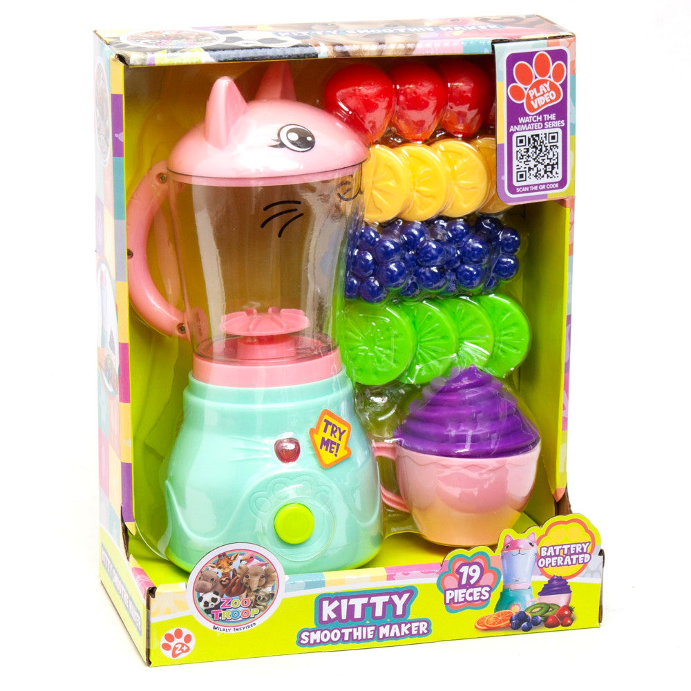 Blend up imaginative fun with the Zoo Troop Kitty Smoothie Maker playset! This interactive battery-operated blender features realistic actions and colorful play food for endless creative smoothie making. Perfectly sized for small hands, it enhances cognitive skills through mix-and-match play. Shop now on toysrus.com and let your little one's culinary creativity soar!